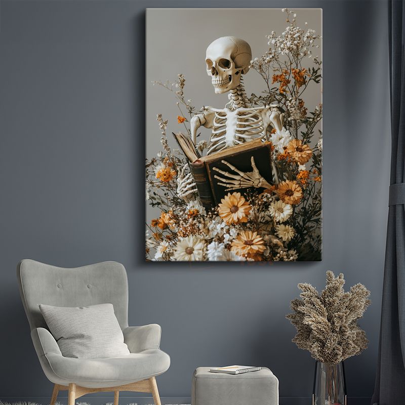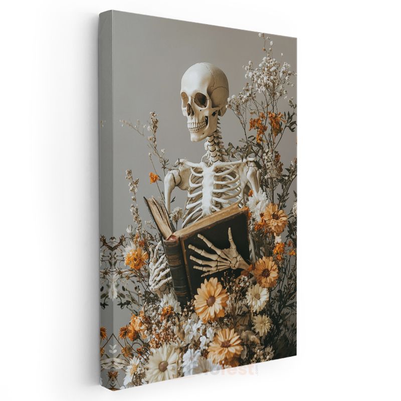Ölümün Bilgeliği - Çiçekler Arasında Kitap Okuyan İskelet Kanvas Tablo