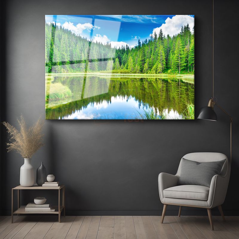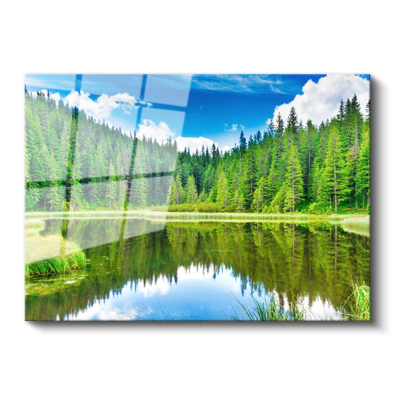 Orman Gölü - Çam Ağaçları ve Yansımalar Cam Tablo