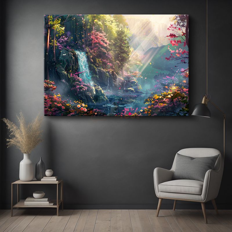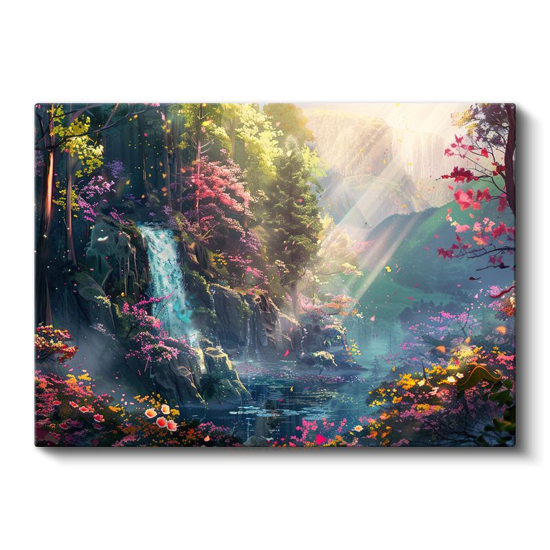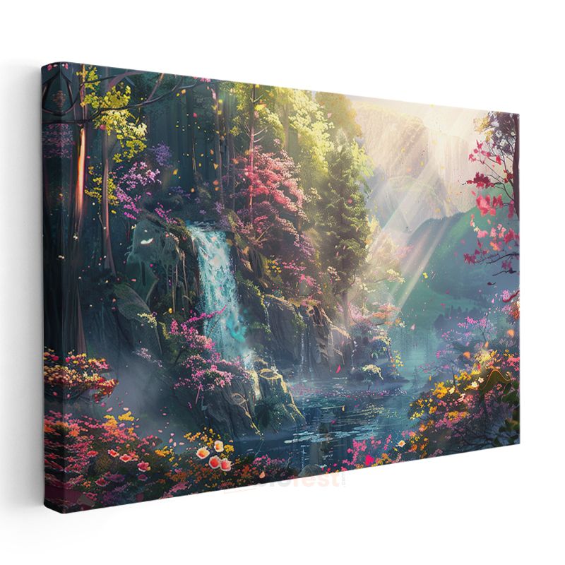Orman Şelalesi - Renkli Çiçeklerle Bezeli Doğa Cenneti Kanvas Tablo