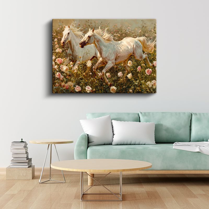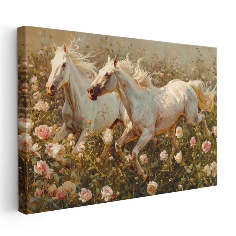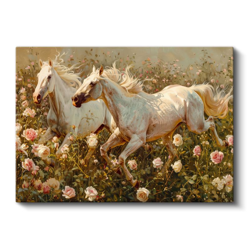 Özgür Koşu - Pastel Çiçekli Alanda Beyaz Atlar Kanvas Tablo