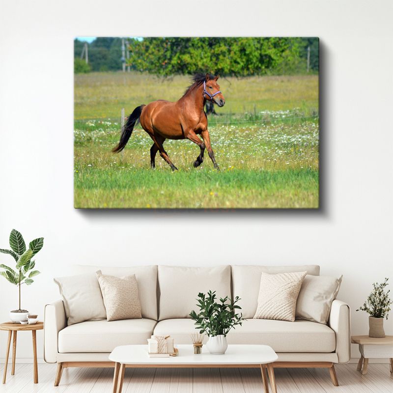 Özgür Ruh - Çayırda Koşan Kahverengi Atın Zarafeti Kanvas Tablo