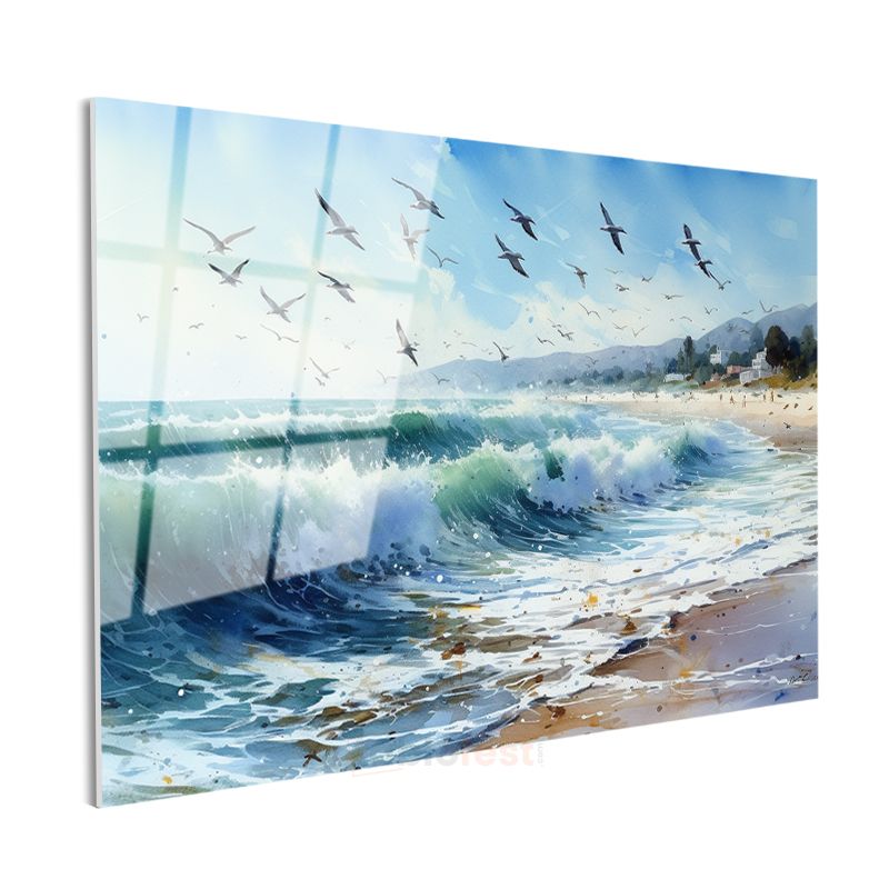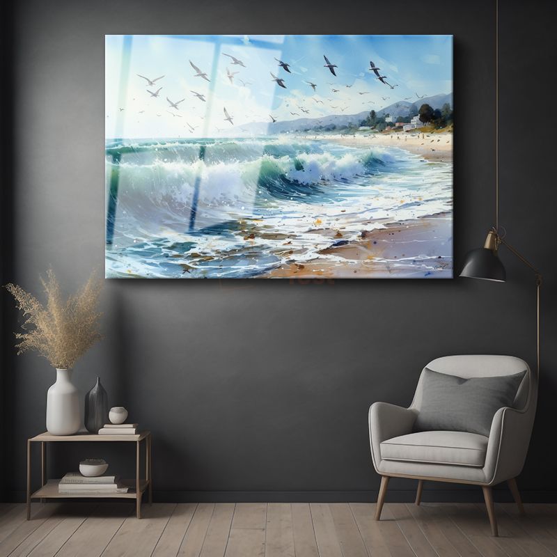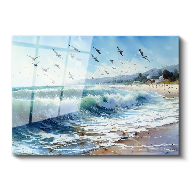 Özgürlük Dalgaları - Kuşların Dansı ve Köpüklü Sahil Cam Tablo