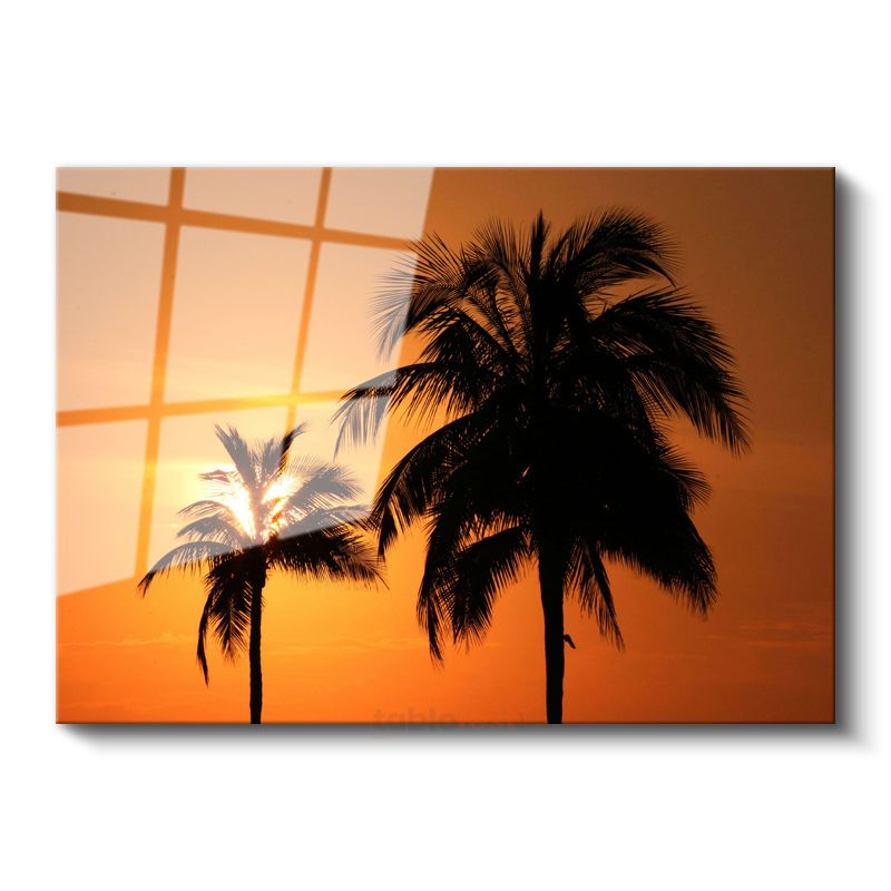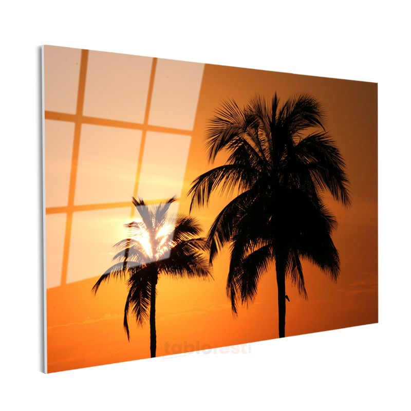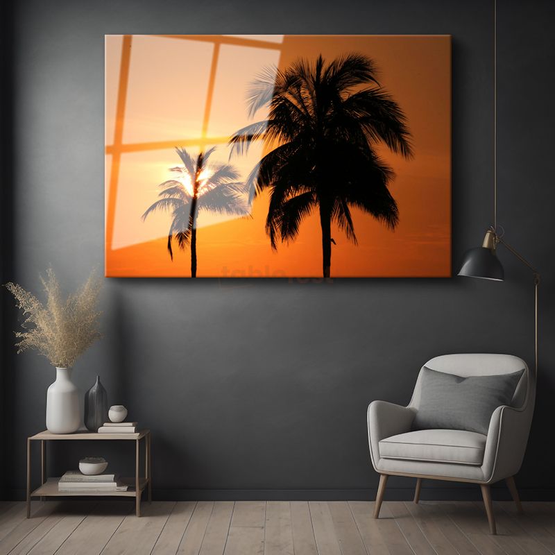Palmiyeler - Turuncu Gün Batımında Tropik Silüetler Cam Tablo