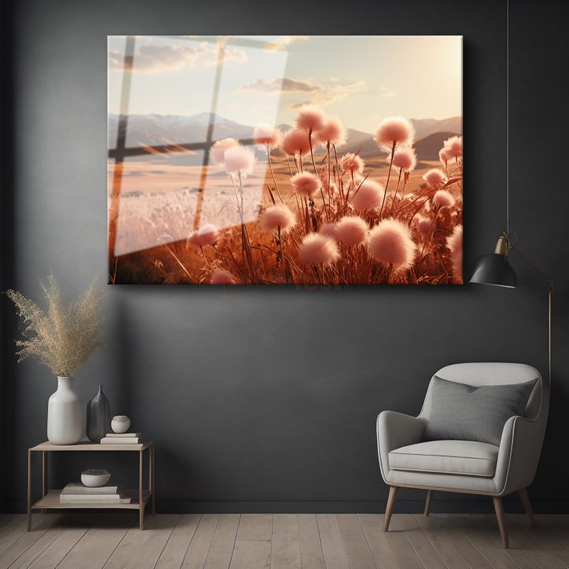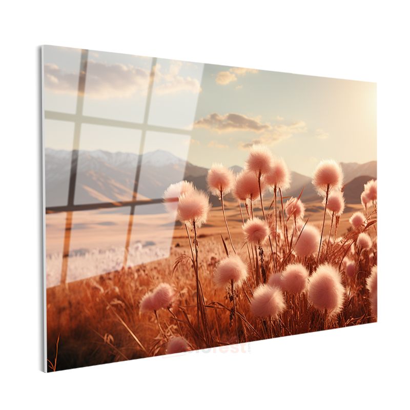 Pamuk Otu Vadisi - Gün Batımında Altın Renkli Dağ Silüetleri Cam Tablo