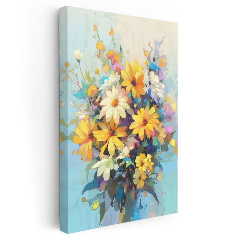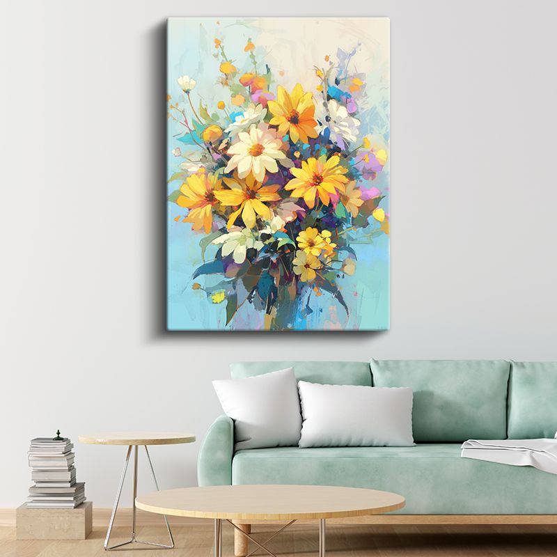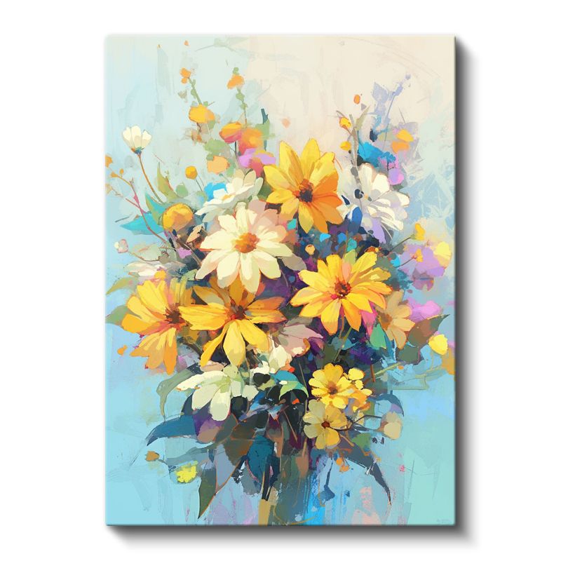 Papatya Buketi - Pastel Mavi Fon Yağlı Boya Kanvas Tablo