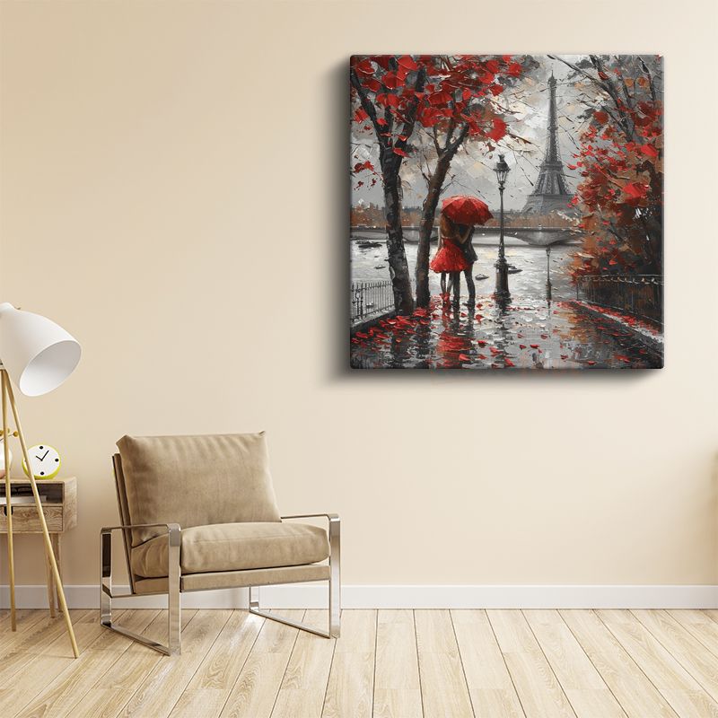 Paris'te Aşk - Kırmızı Şemsiyeli Romantizm Kanvas Tablo