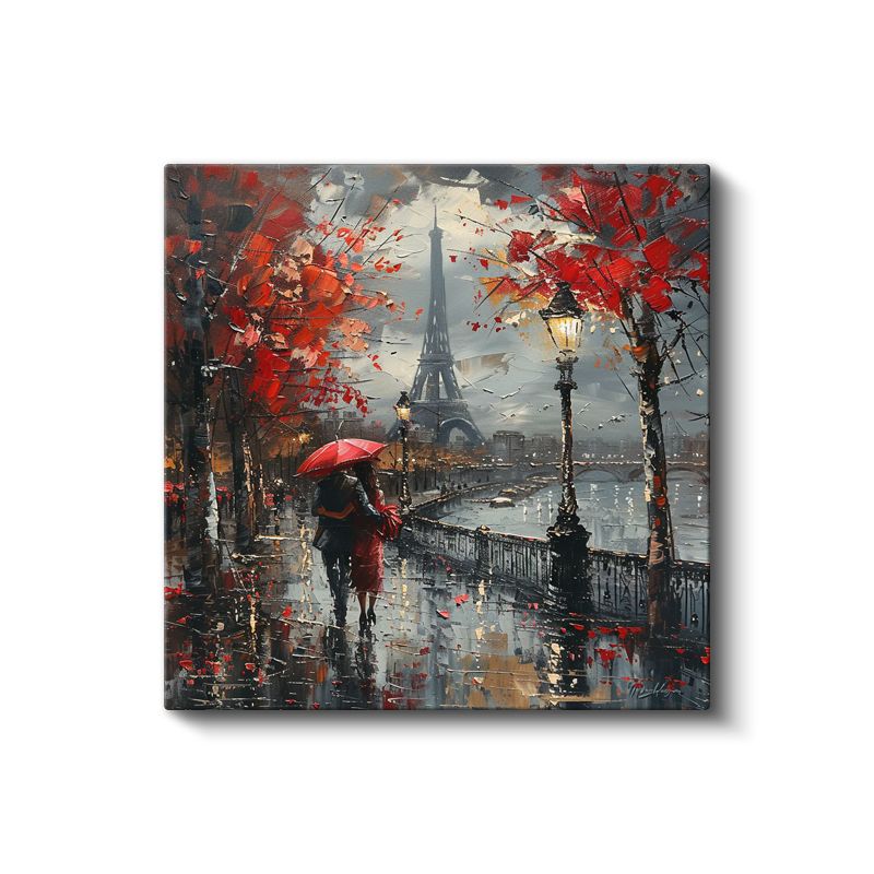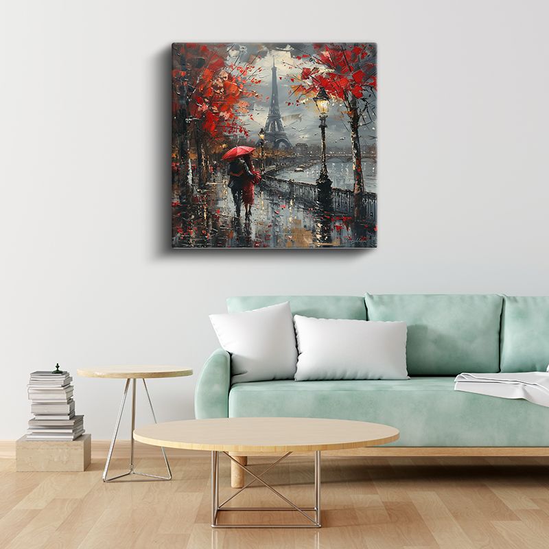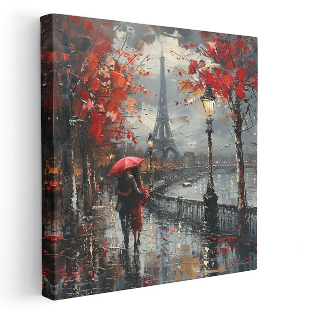 Paris'te Yağmur - Kırmızı Şemsiyeli Romantizm Kanvas Tablo