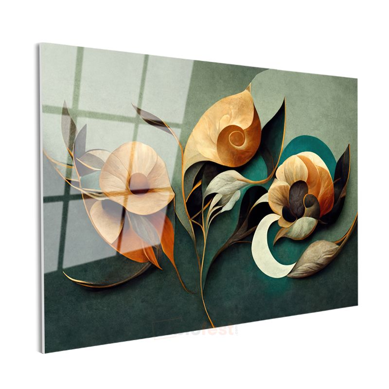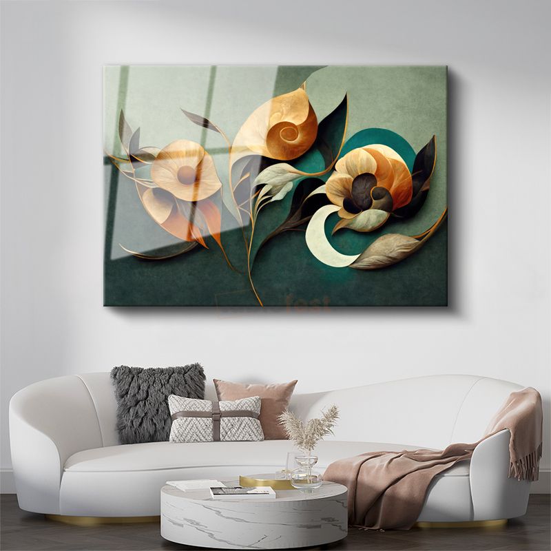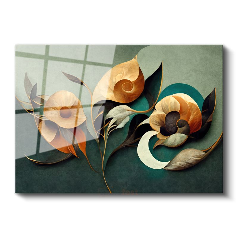 Pastel Çiçekler - Mavi ve Bej Tonlu Çiçek Kompozisyonu Cam Tablo