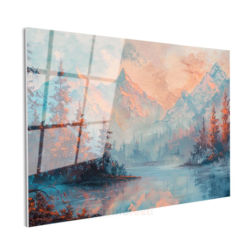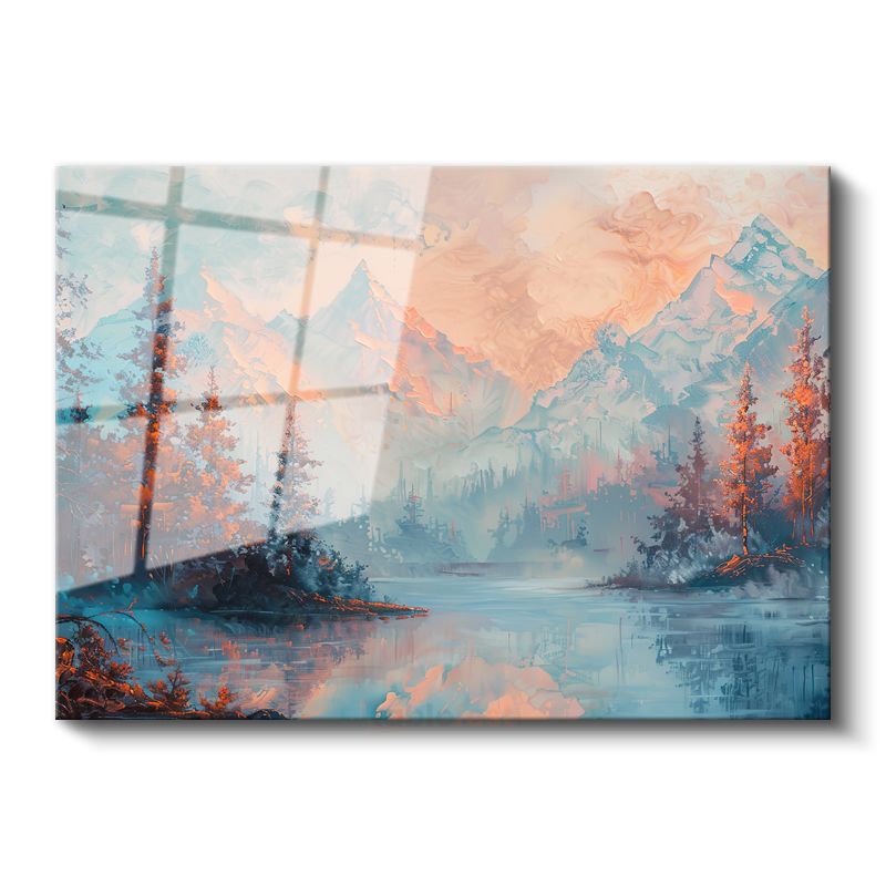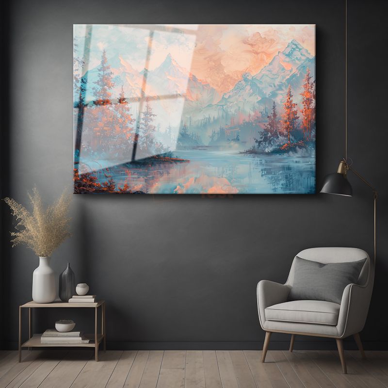 Pastel Dağlar - Göl Kenarında Huzur Veren Manzara Cam Tablo