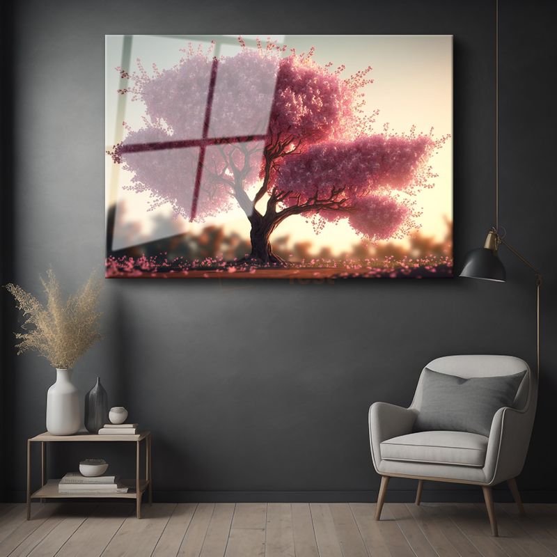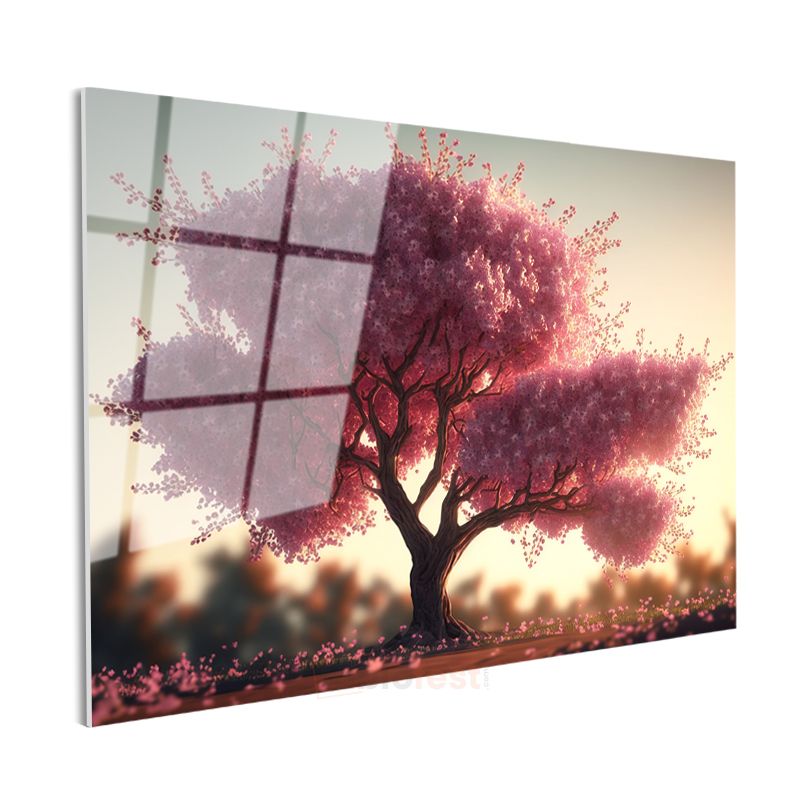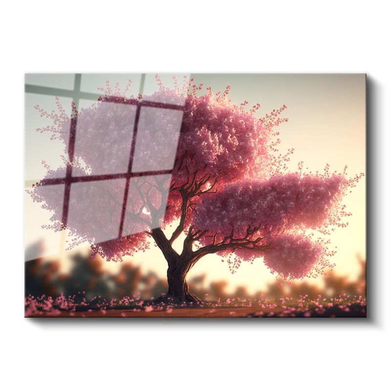 Pembe Ağaç - Gün Batımında Büyüleyici Doğa Cam Tablo