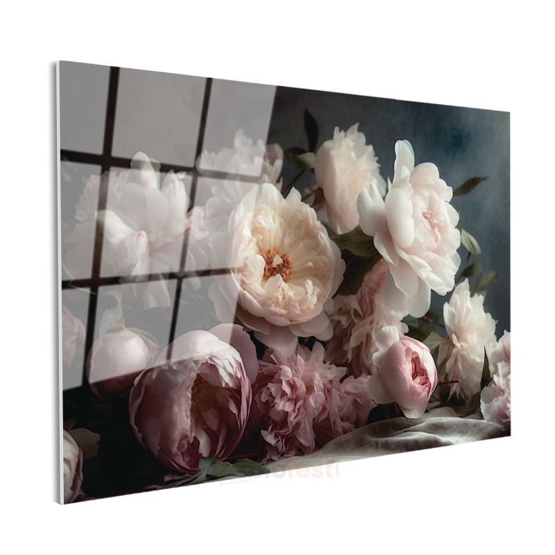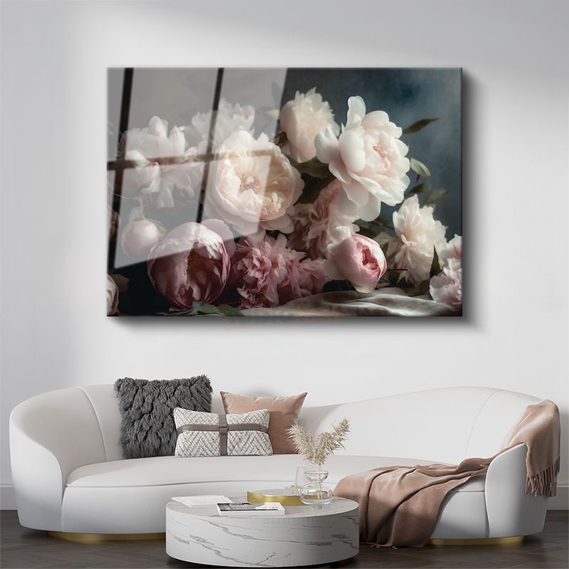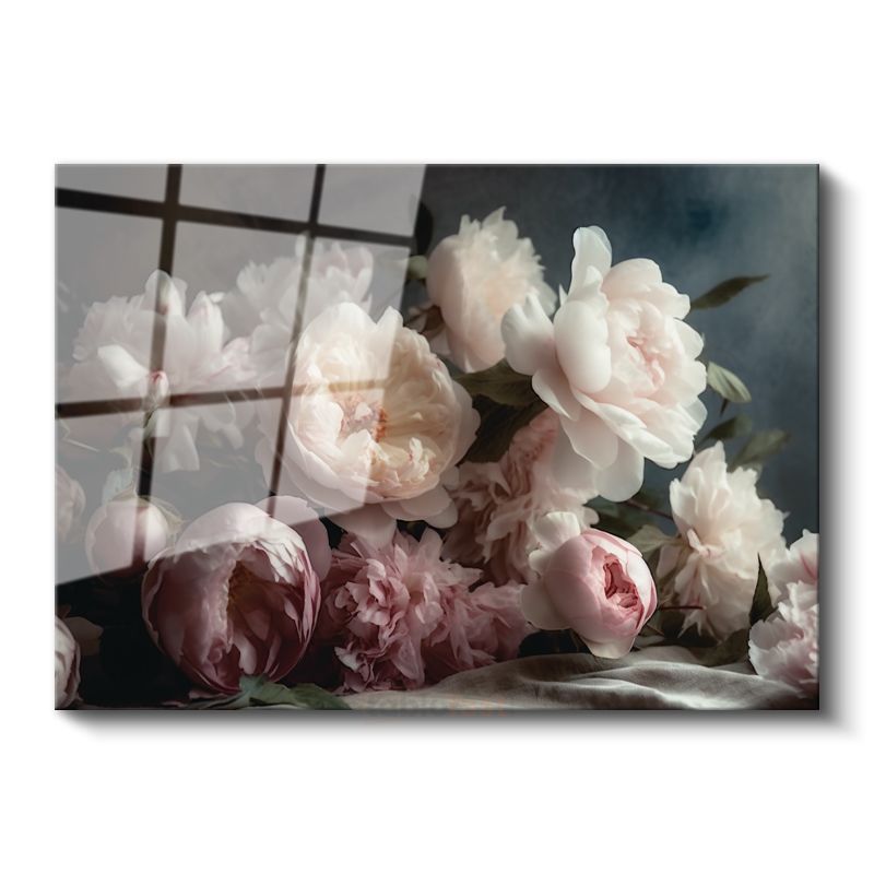 Pembe Beyaz Şakayıklar - Vintage Tarzı Romantik Buket Cam Tablo