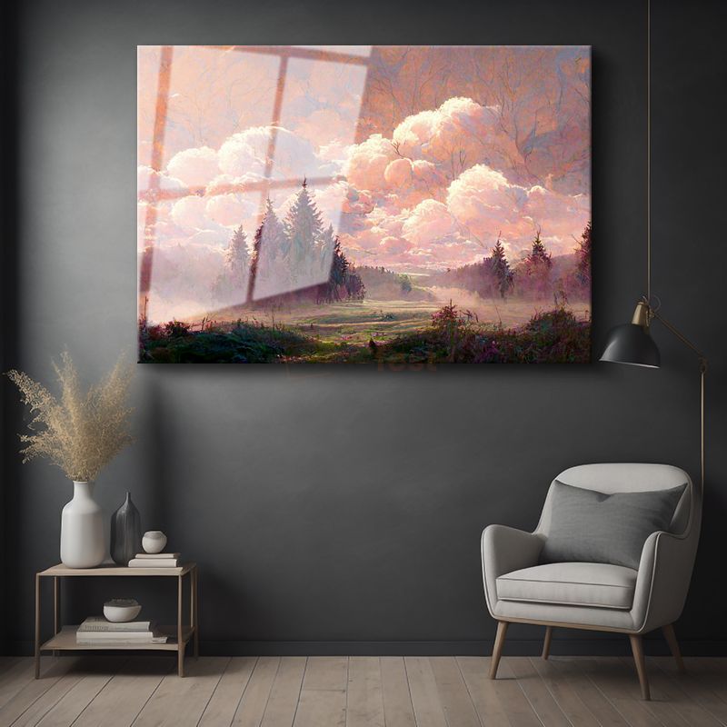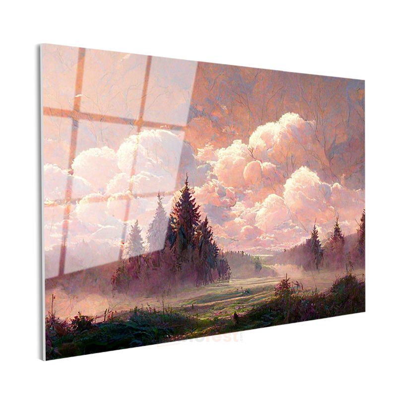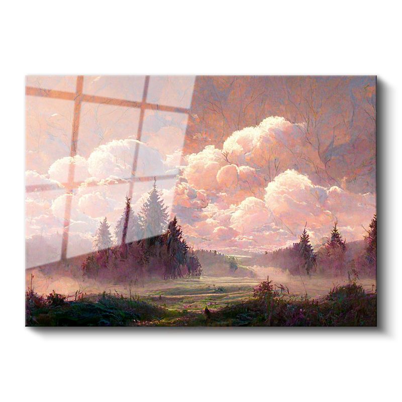 Pembe Bulutlar - Sisli Ormanda Gün Doğumu Cam Tablo
