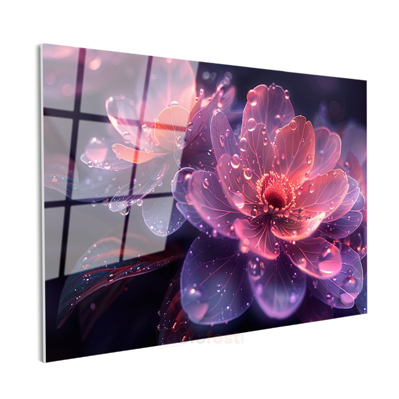 Pembe Çiçek - Dijital Sanat Su Damlacıklı Cam Tablo