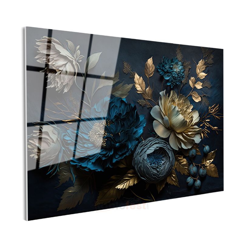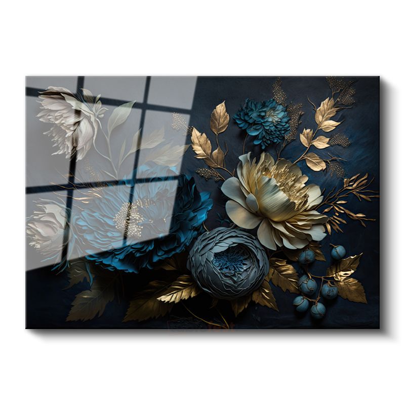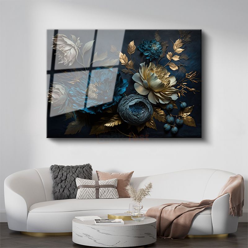 Pembe Çiçekler - Altın Yapraklı Zarif Kompozisyon Cam Tablo