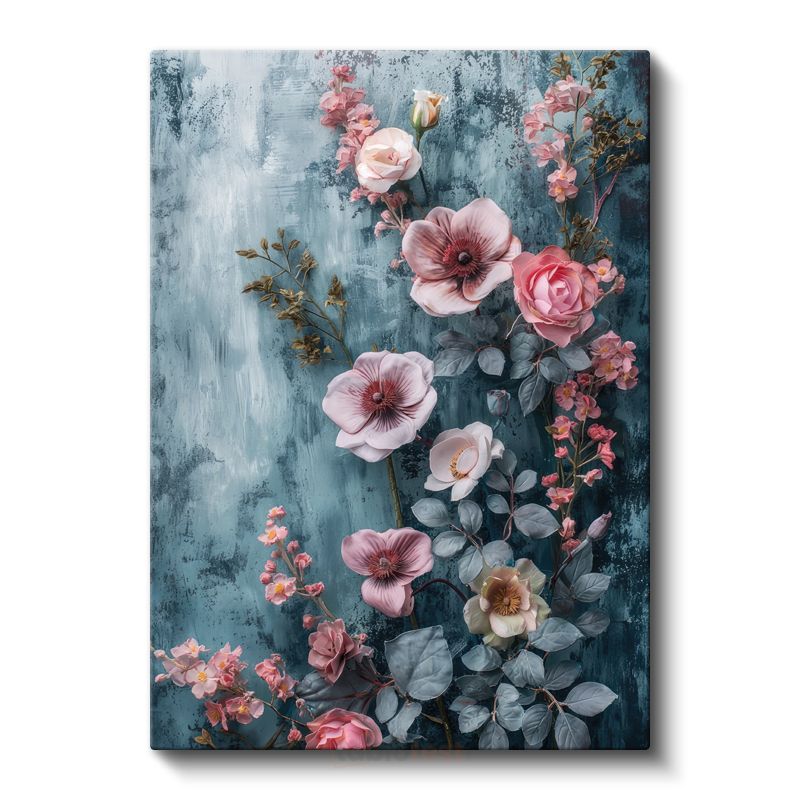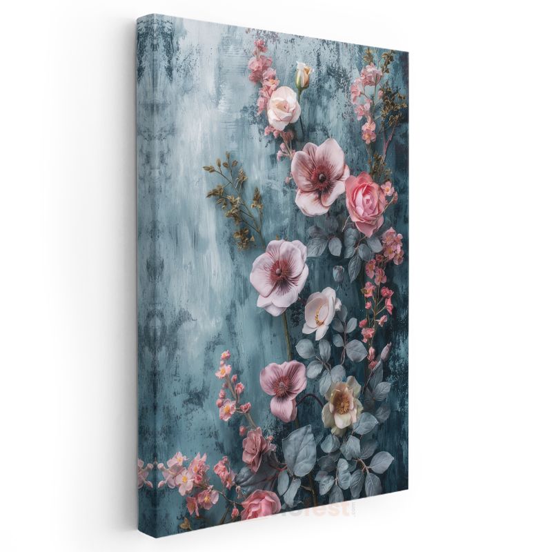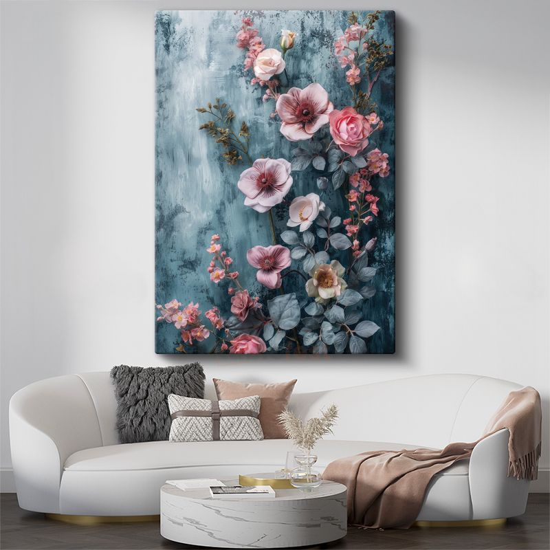 Pembe Çiçekler - Mavi Dokulu Arka Plan Kanvas Tablo