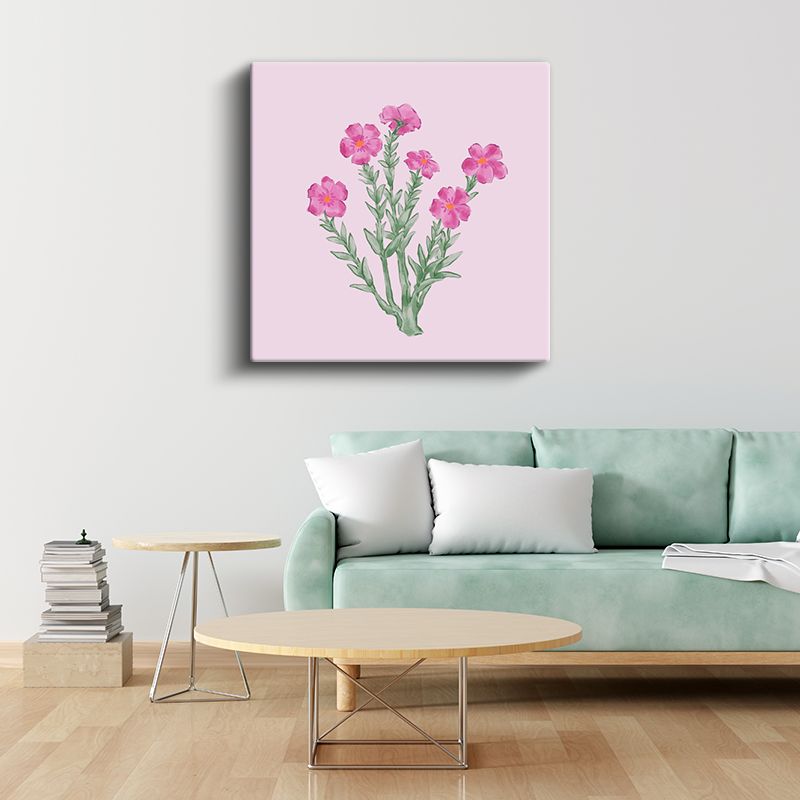 Pembe Çiçekler - Pastel Fonda Zarif Botanik İllüstrasyon Kanvas Tablo