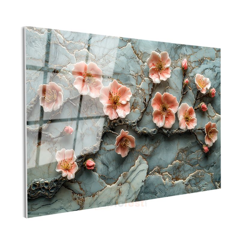 Pembe Çiçekler - Turkuaz Mermer Dokulu Kabartma Görünümlü Sanat Cam Tablo
