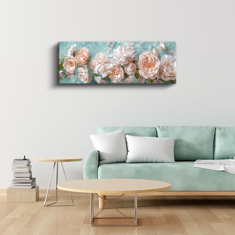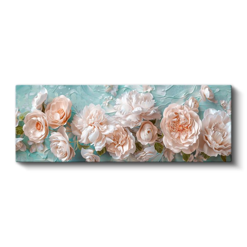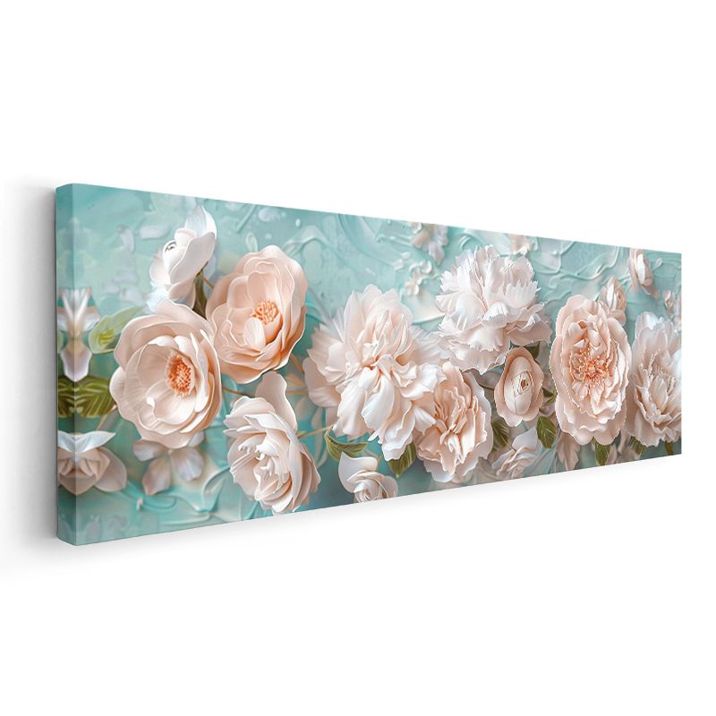 Pembe Güller - Turkuaz Fonda Kabartma Görünümlü Çiçek Serisi Kanvas Tablo