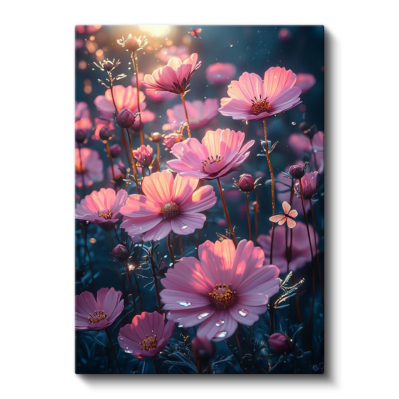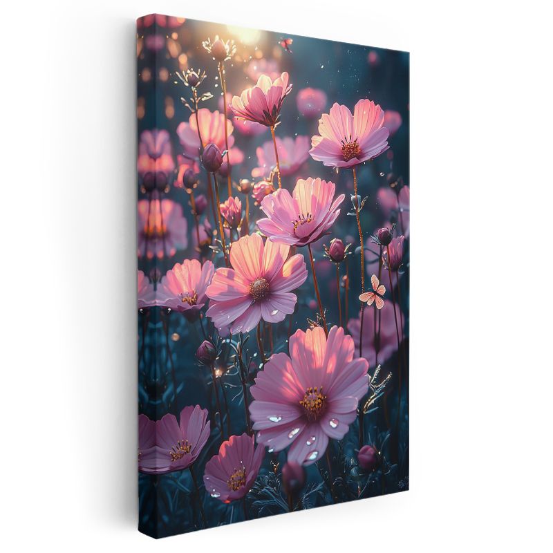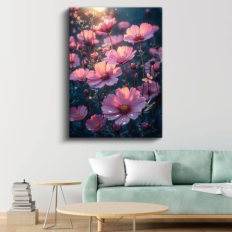 Pembe Kozmos - Gün Batımı Işığında Çiçek Bahçesi Kanvas Tablo