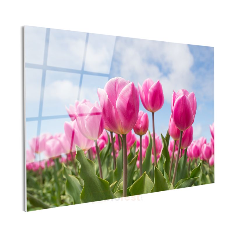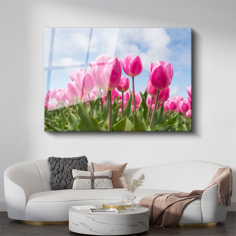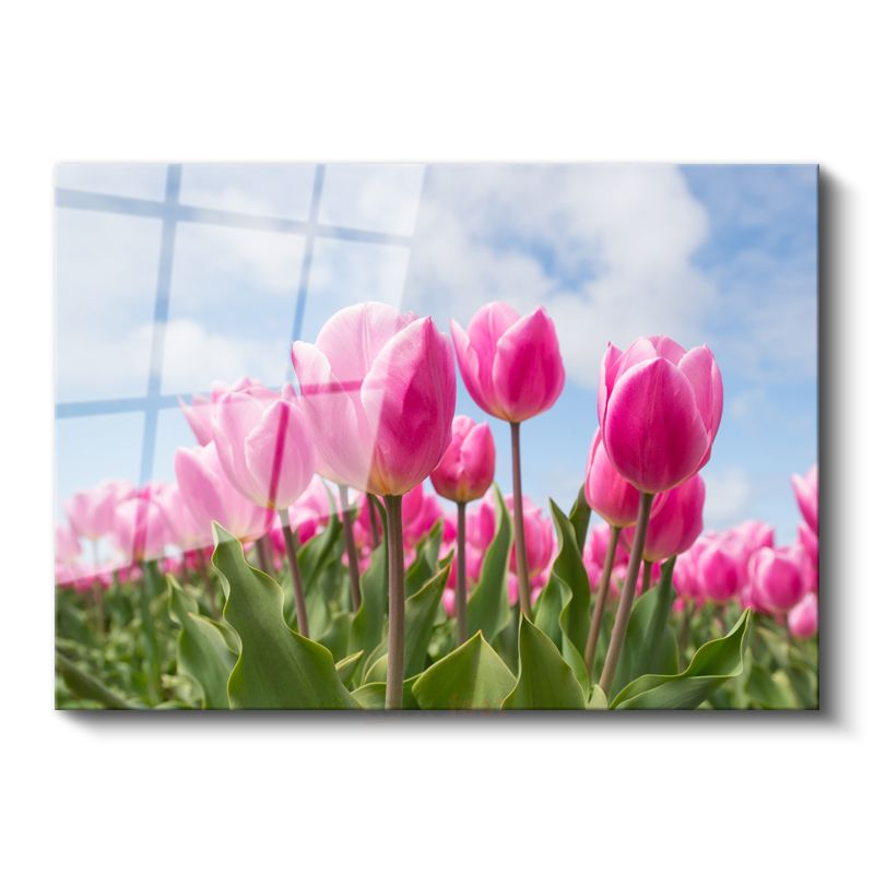 Pembe Lale Tarlası - Mavi Gökyüzü Altında Bahar Çiçekleri Cam Tablo