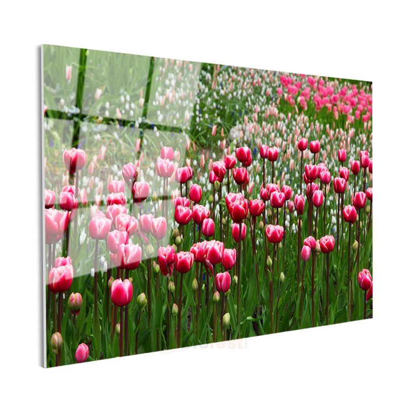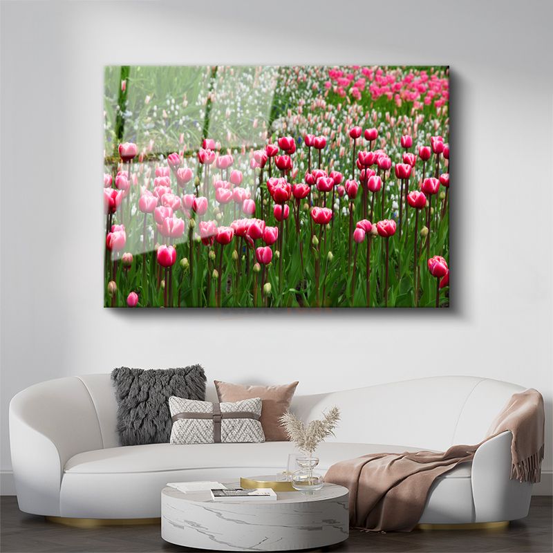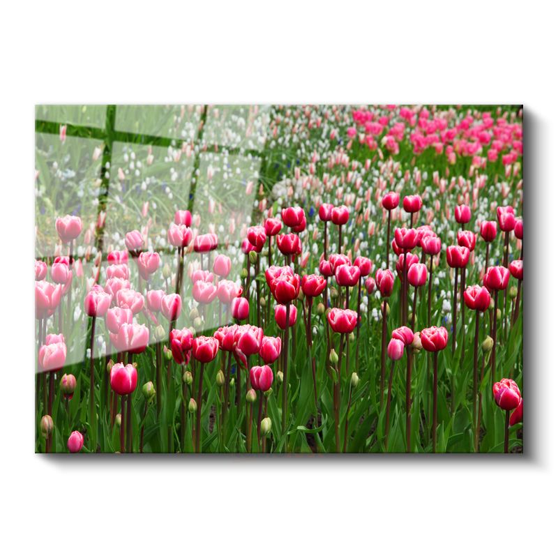 Pembe Laleler - Bahar Bahçesi Manzarası Cam Tablo