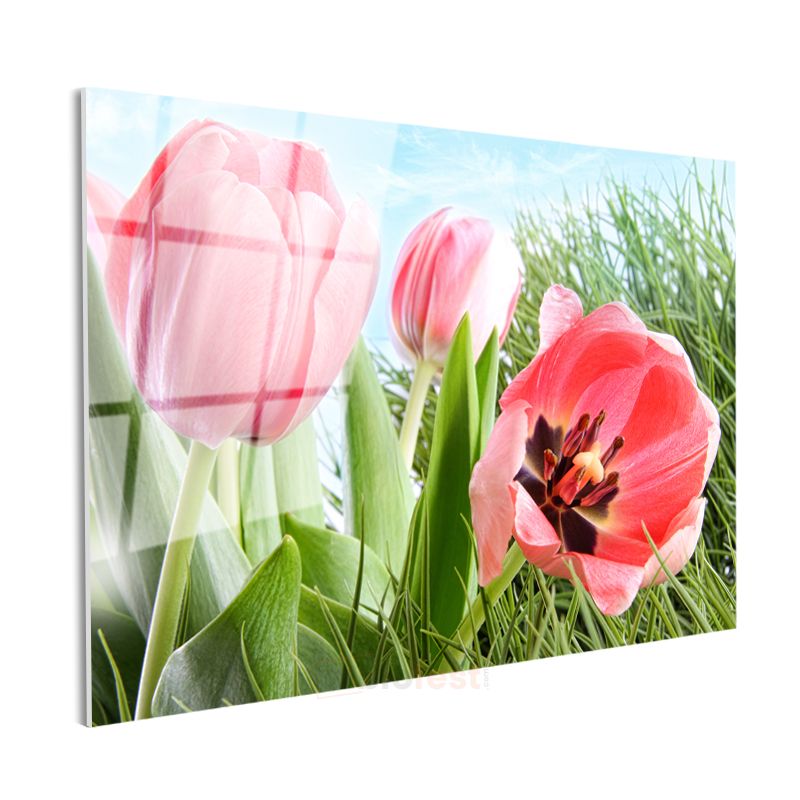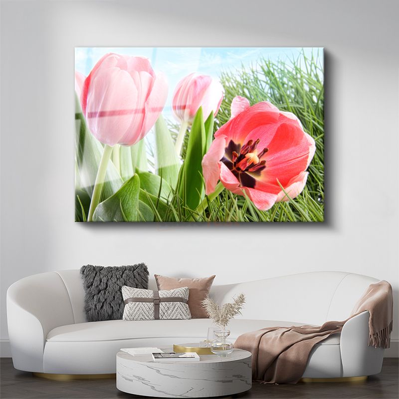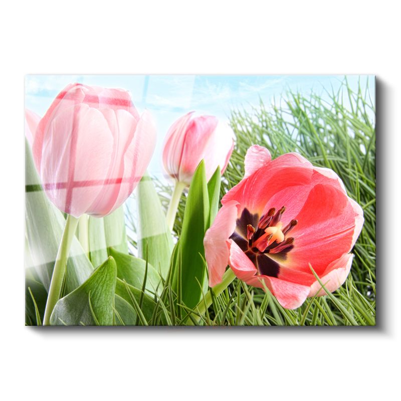 Pembe Laleler - Bahar Çayırında Taze Çiçekler Cam Tablo
