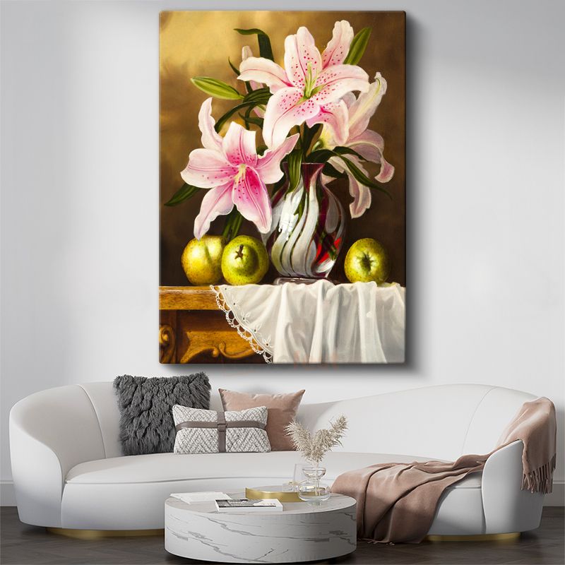 Pembe Lilyumlar - Yeşil Elmalarla Zarif Çiçek Kompozisyonu Kanvas Tablo