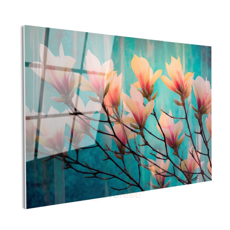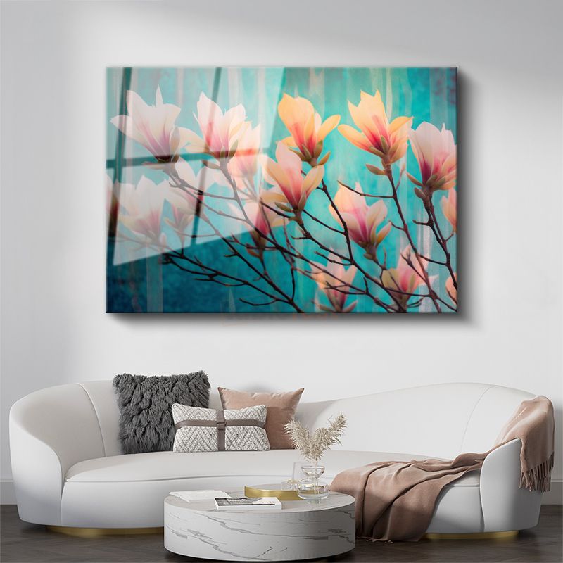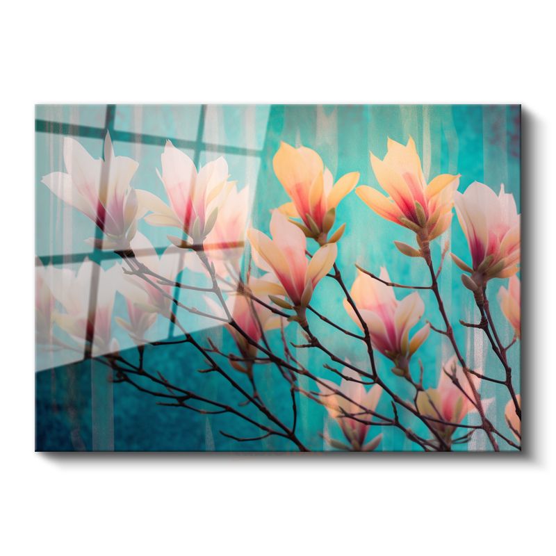 Pembe Manolyalar - Turkuaz Fonda Çiçek Şöleni Cam Tablo