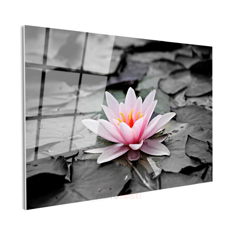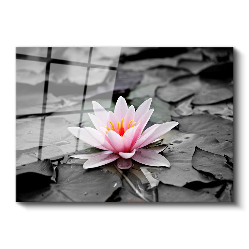 Pembe Nilüfer - Siyah Beyaz Yapraklar Üzerinde Cam Tablo