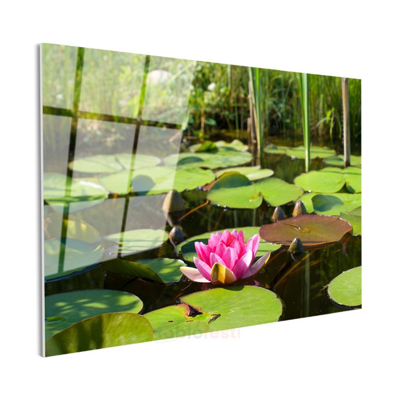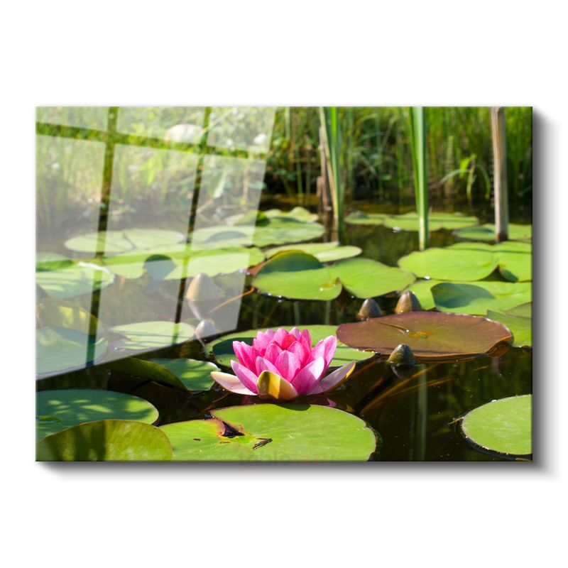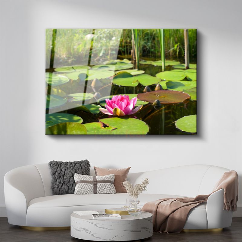 Pembe Nilüfer - Yeşil Yapraklar Arasında Göl Çiçeği Cam Tablo