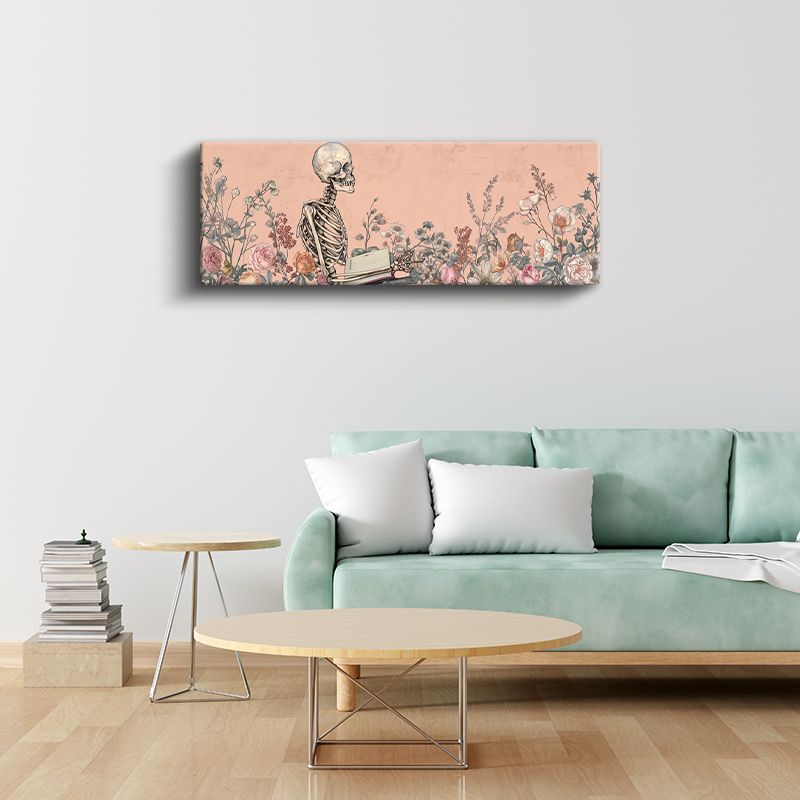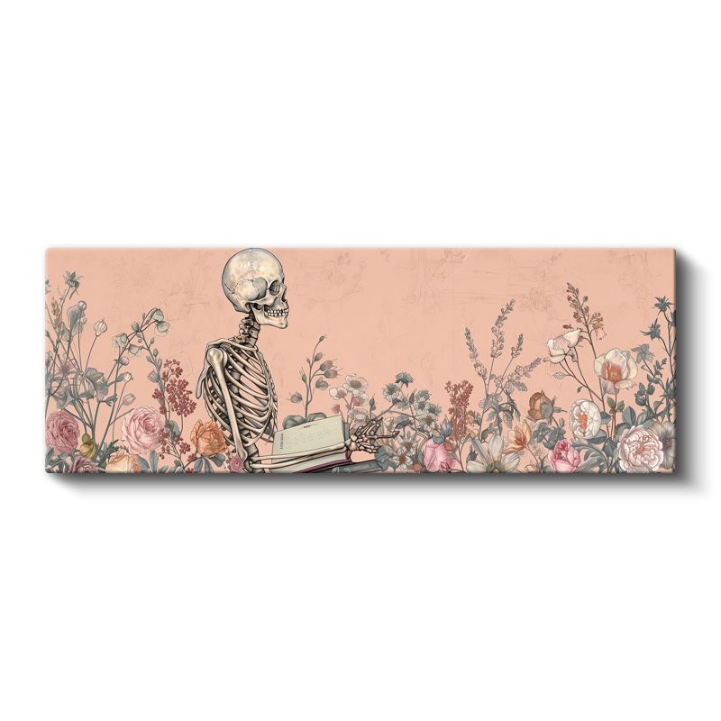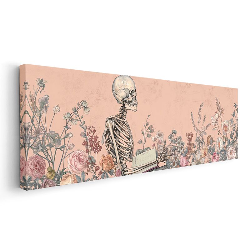Pembe Ölümsüzlük - Çiçekler Arasında Bilgelik Arayan İskelet Kanvas Tablo