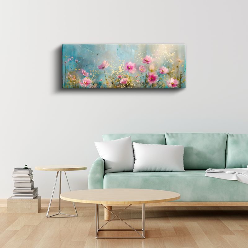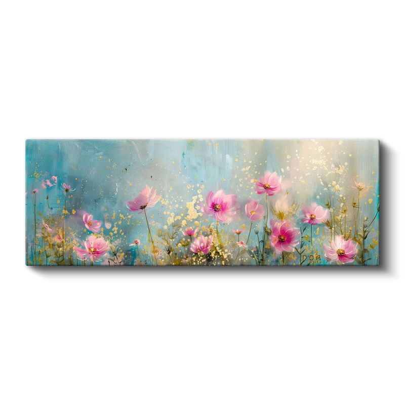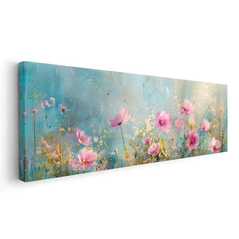 Pembe Papatyalar - Mavi ve Altın Detaylı Suluboya Tarzı Çiçek Bahçesi Kanvas Tablo