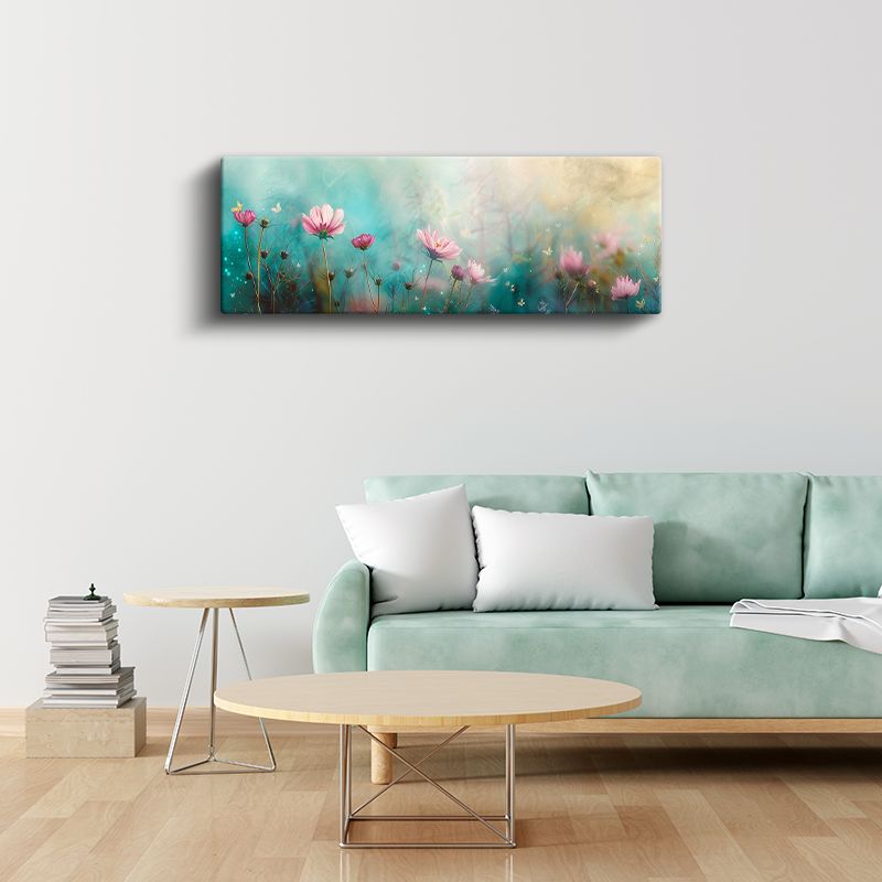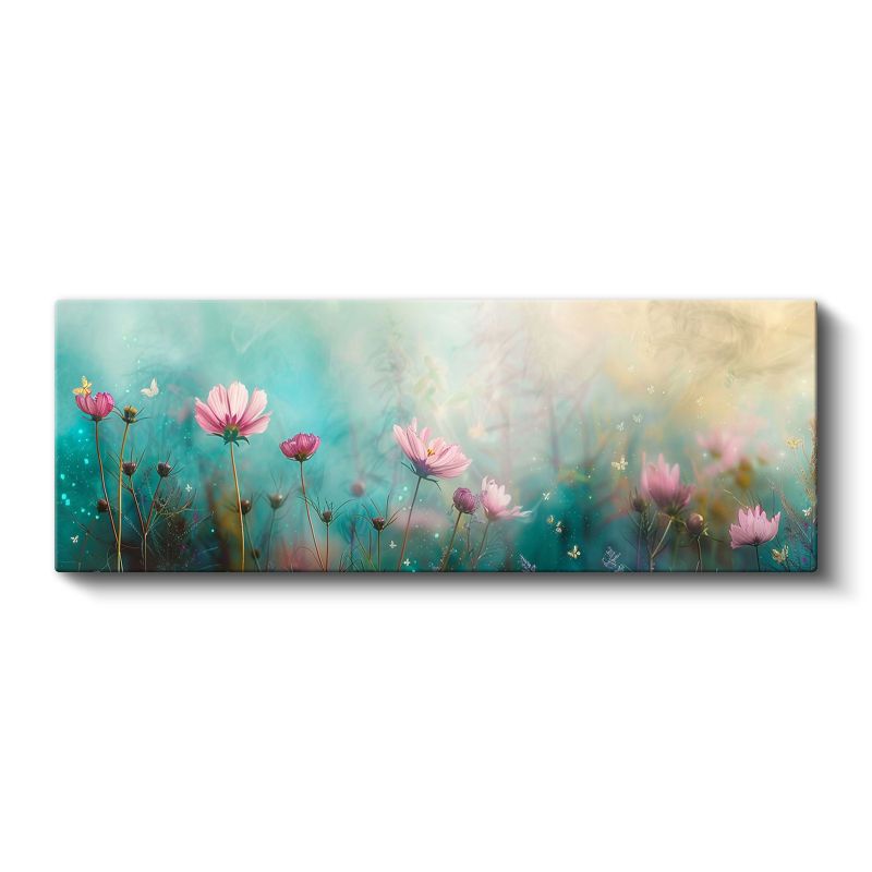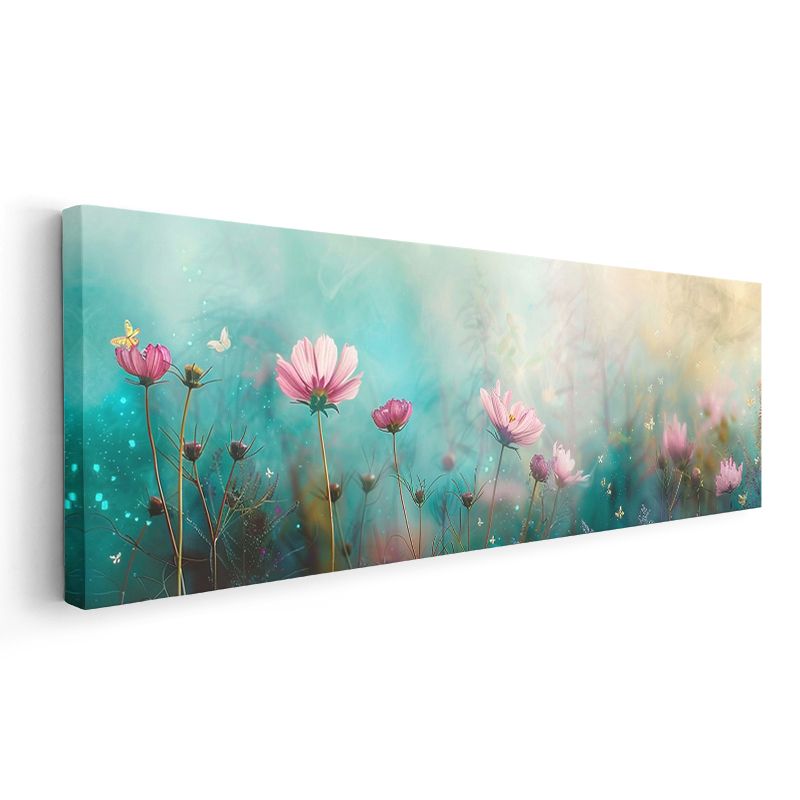 Pembe Papatyalar - Turkuaz Arka Planlı Kelebek Detaylı Kompozisyon Kanvas Tablo