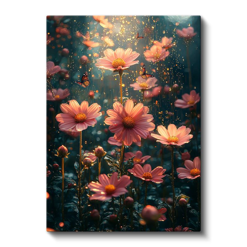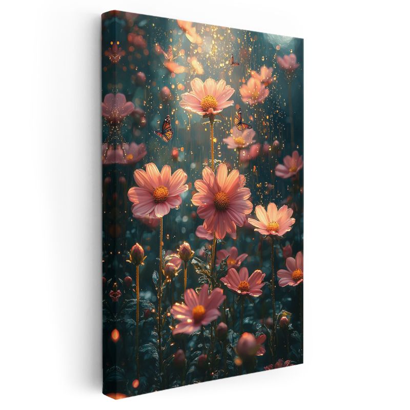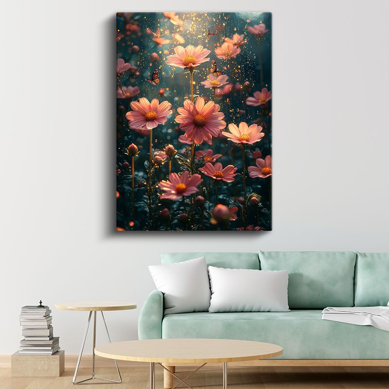 Peri Bahçesi - Altın Işıltılı Pembe Papatyalar Kanvas Tablo