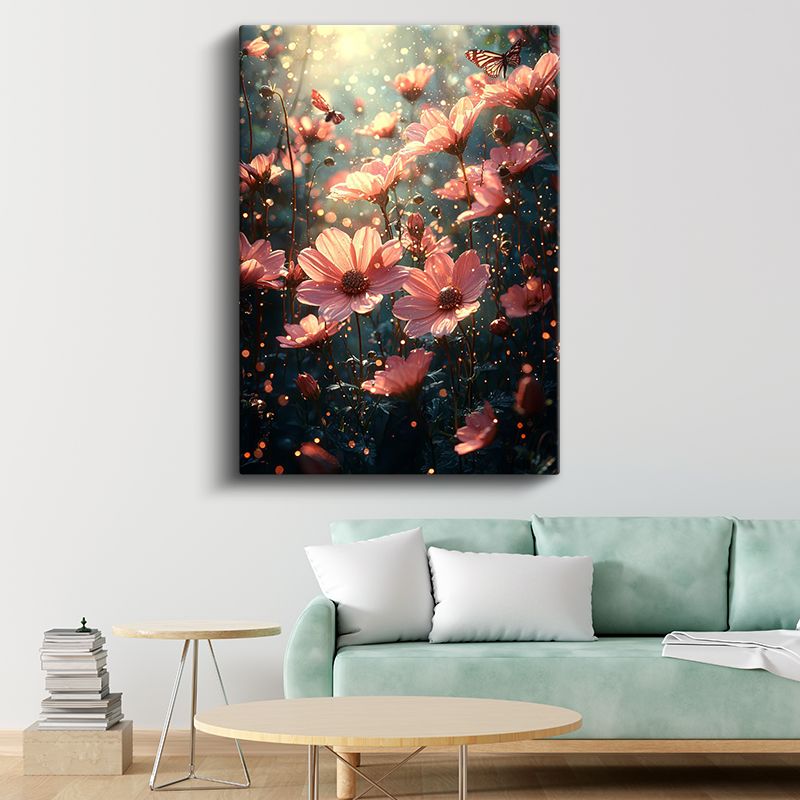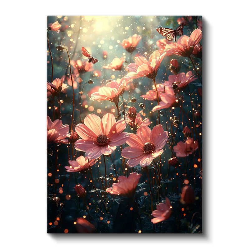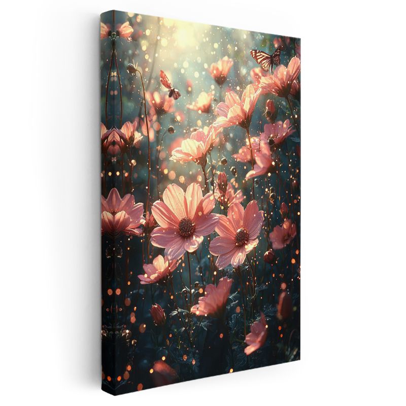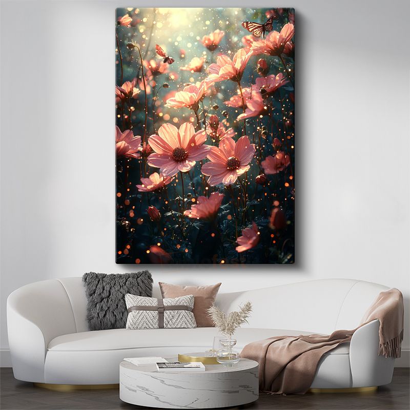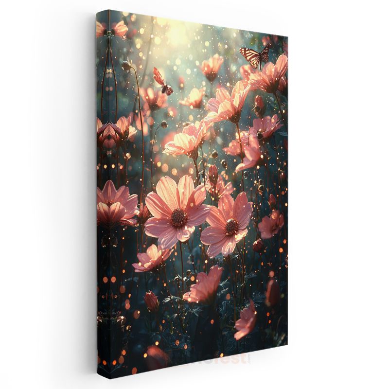 Peri Bahçesi - Işıltılı Pembe Çiçekler ve Kelebekler Kanvas Tablo
