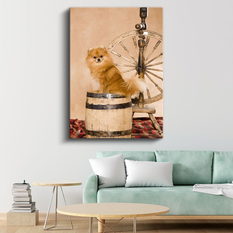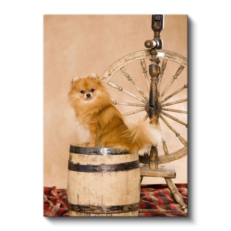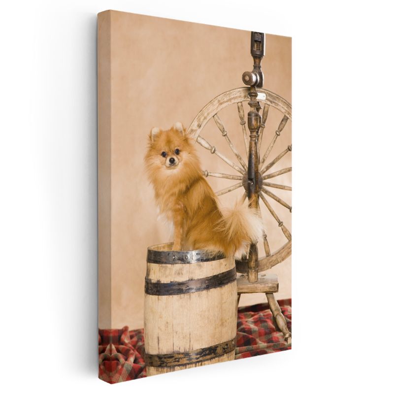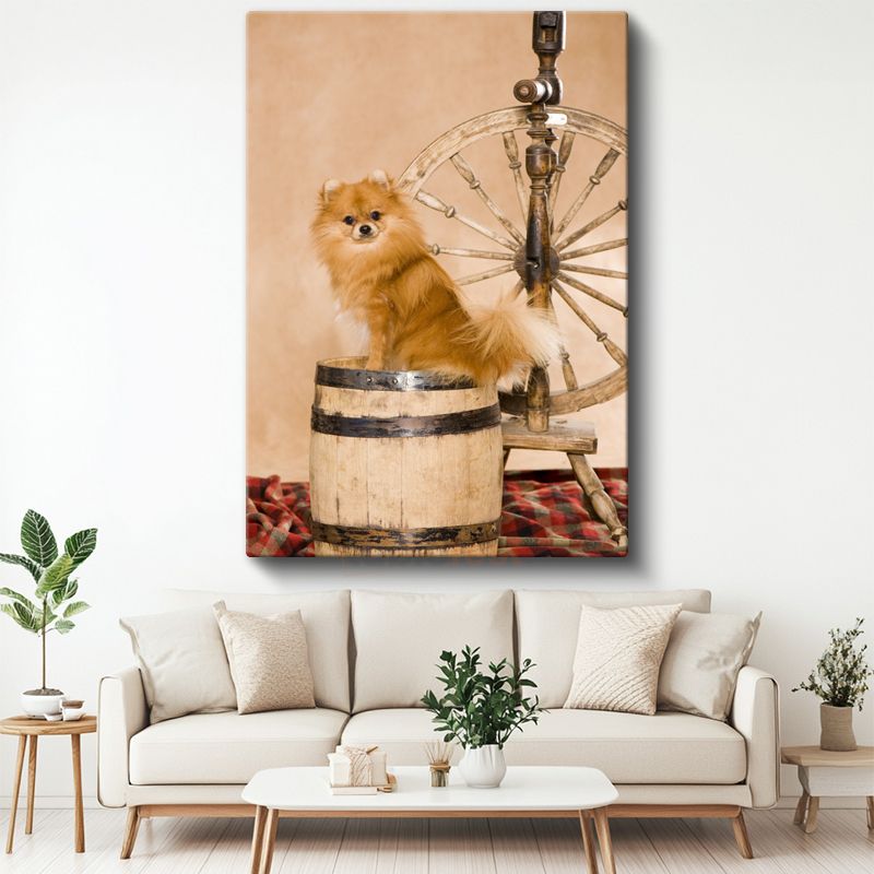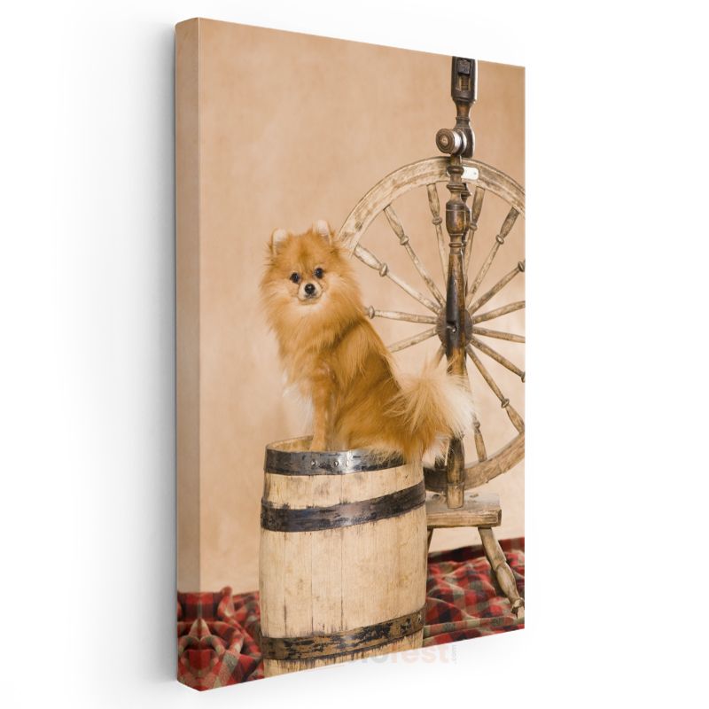 Pomeranian Köpek - Ahşap Fıçı Üzerinde Sevimli Tüylü Dost Kanvas Tablo