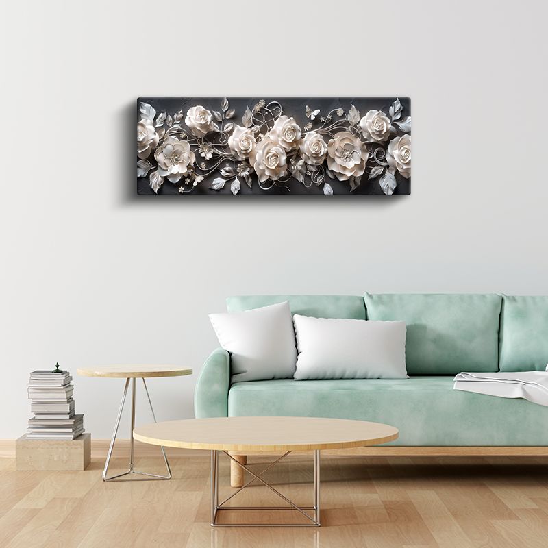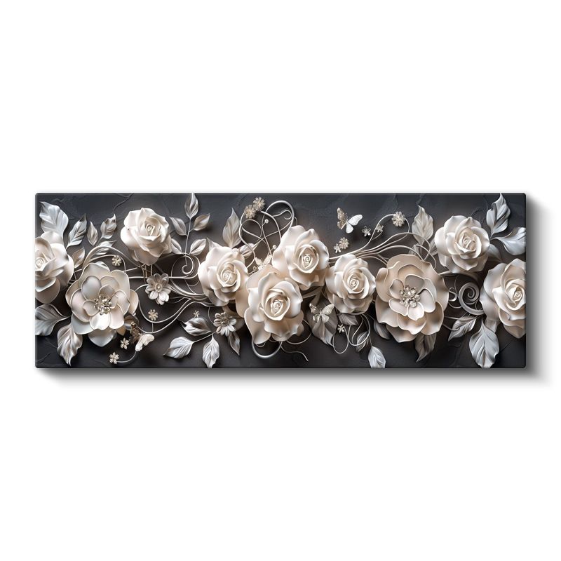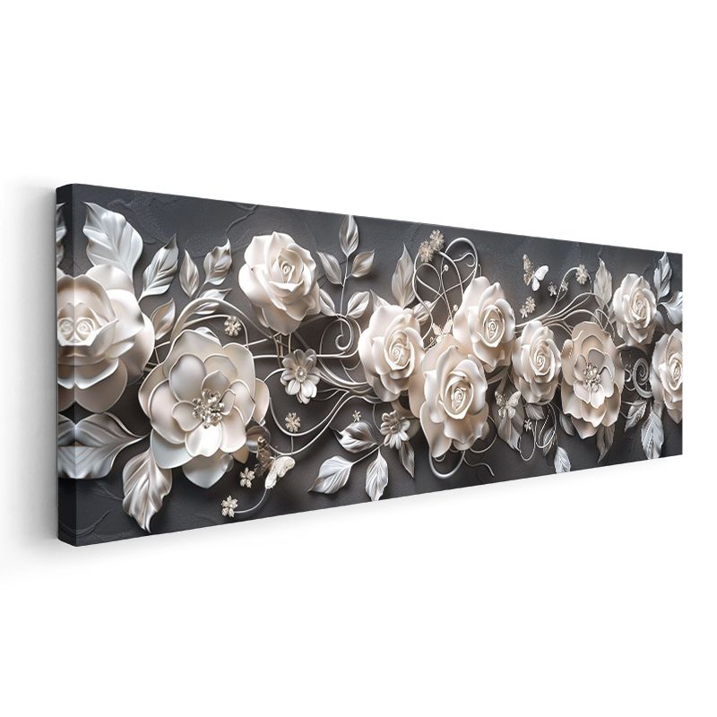 Porselen Güller - Siyah Zeminde 3D Kabartma Efektli Zarif Kompozisyon Kanvas Tablo