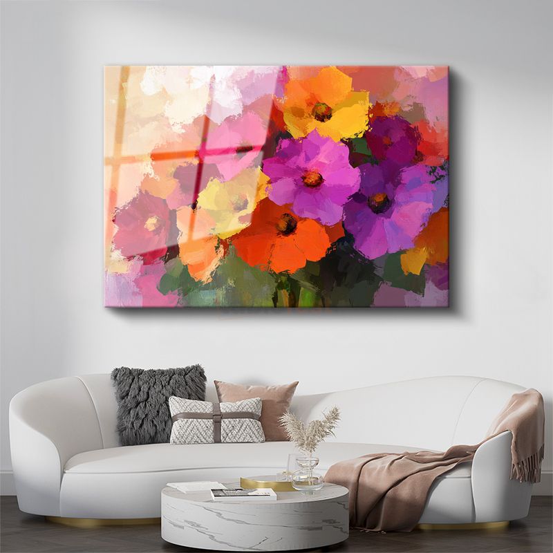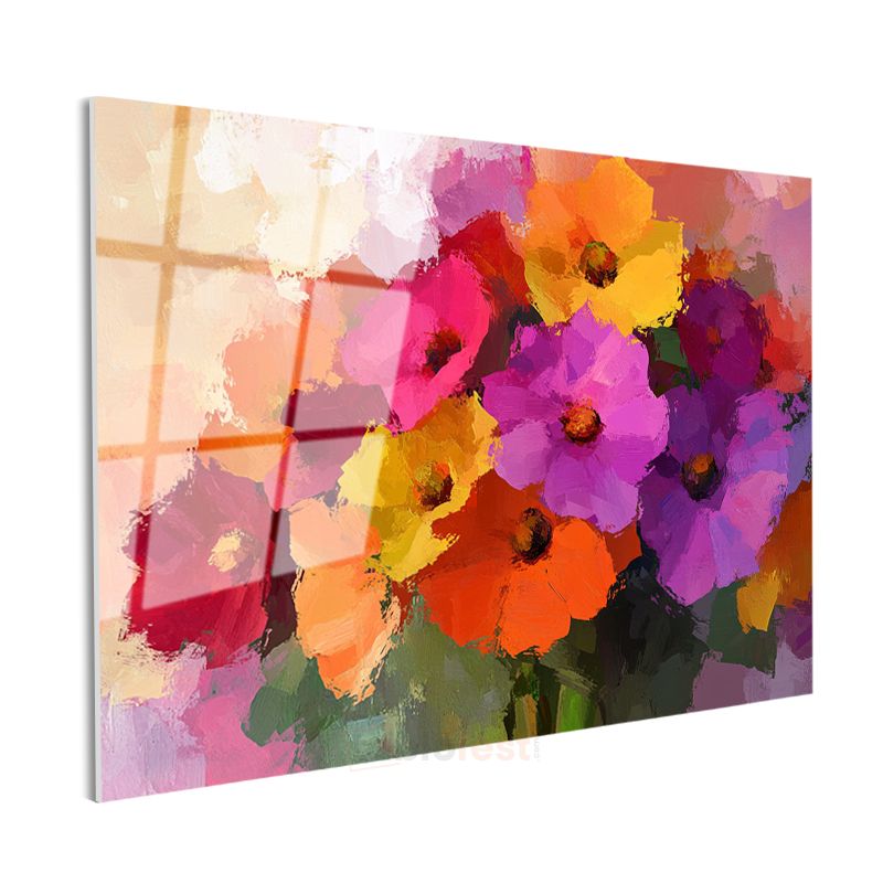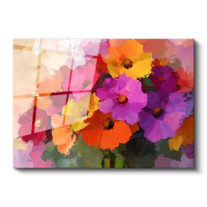 Renk Cümbüşü - Canlı Tonlarda Soyut Çiçek Kompozisyonu Cam Tablo
