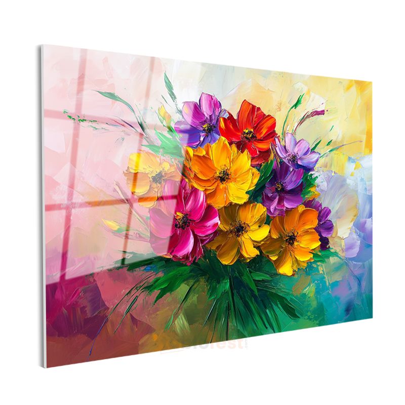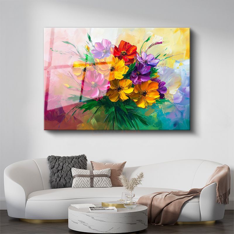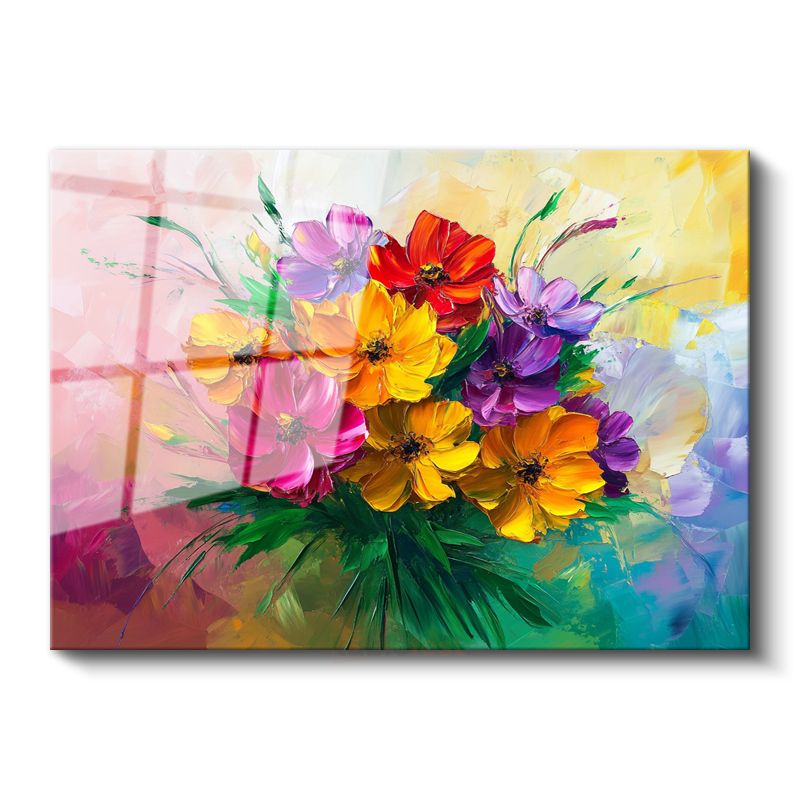 Renkli Çiçek Buketi - Canlı Renklerde Empresyonist Tarz Cam Tablo