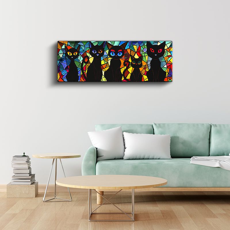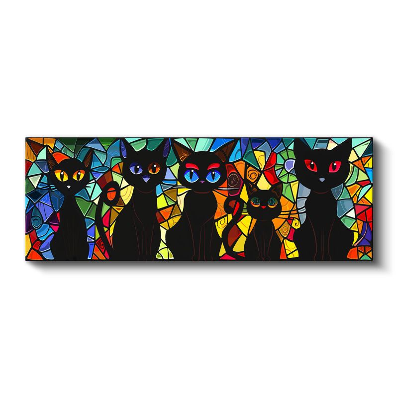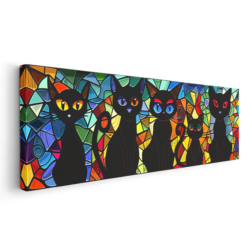 Renkli Gözlü Kediler - Vitray Desenli Siyah Kedi Koleksiyonu Kanvas Tablo