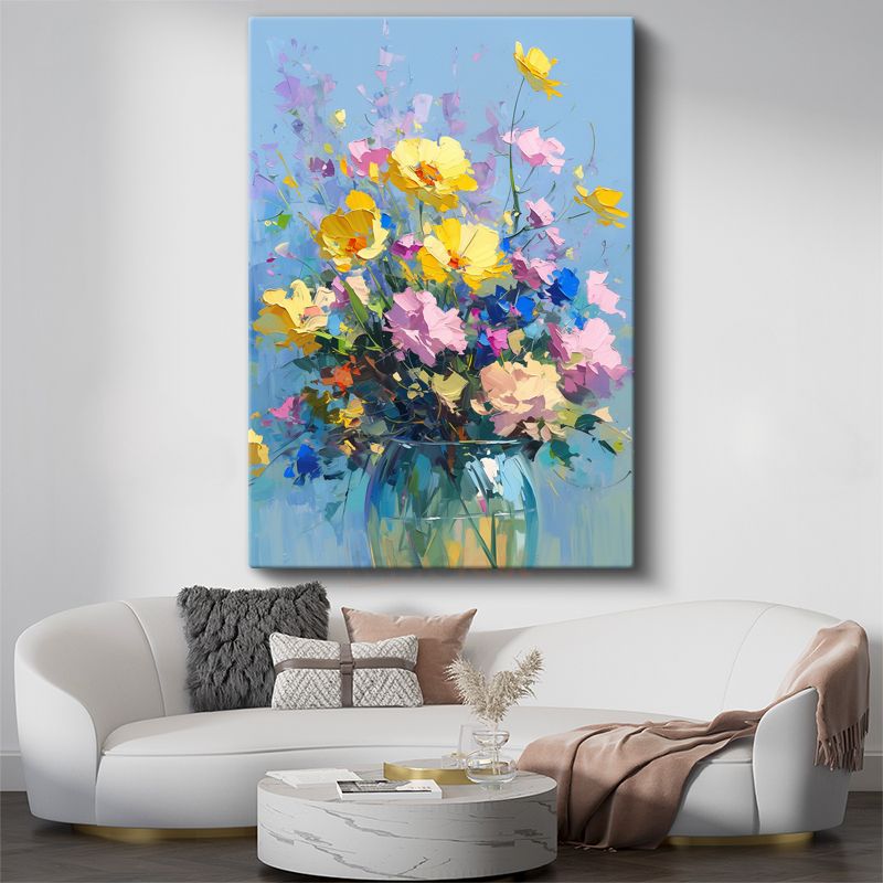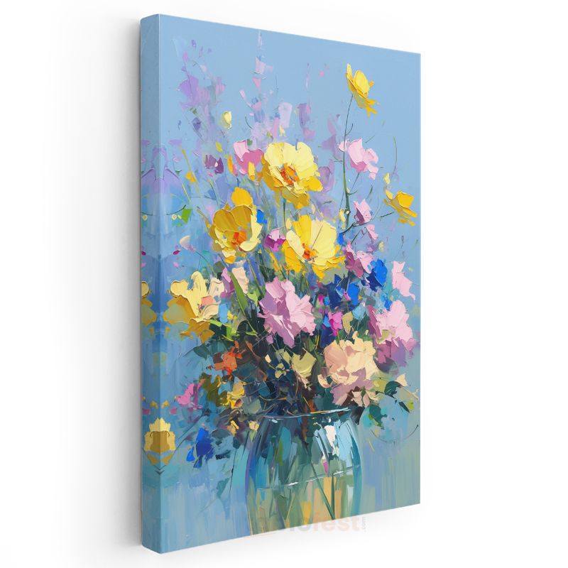 Renkli Kır Çiçekleri - Mavi Fon Üzerinde İmpasto Tekniği Kanvas Tablo