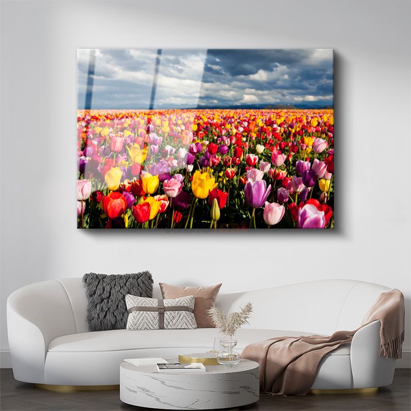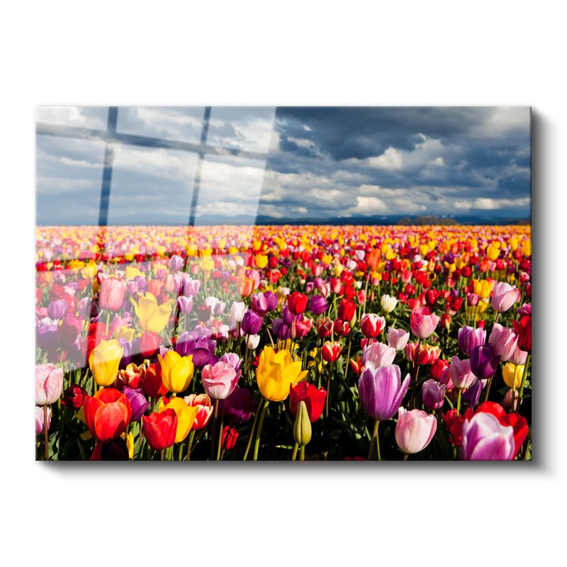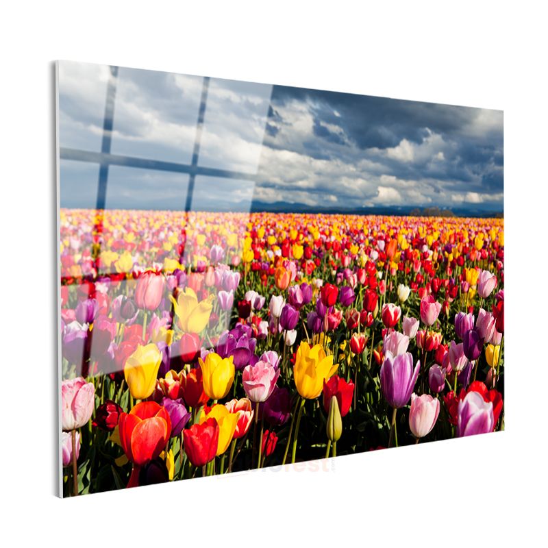 Renkli Lale Tarlası - Gökyüzü Altında Çiçek Denizi Cam Tablo