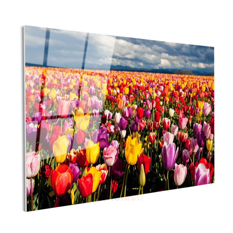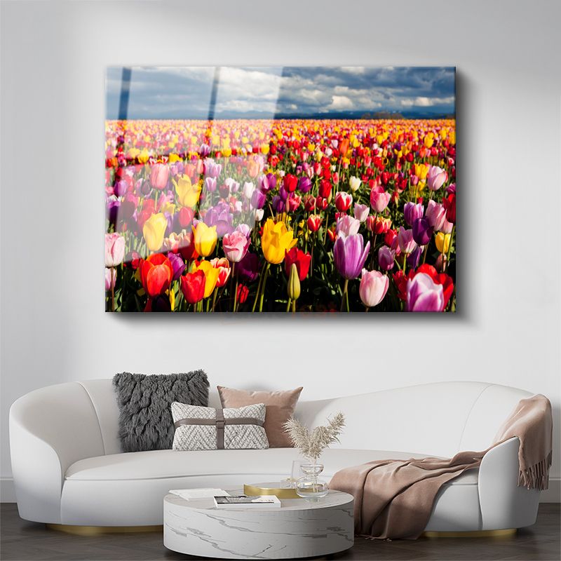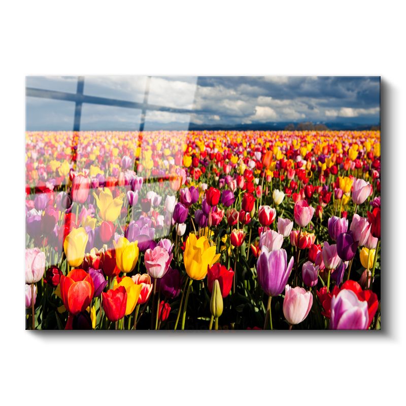 Renkli Lale Tarlası - Gökyüzü Altında Çiçek Denizi Cam Tablo
