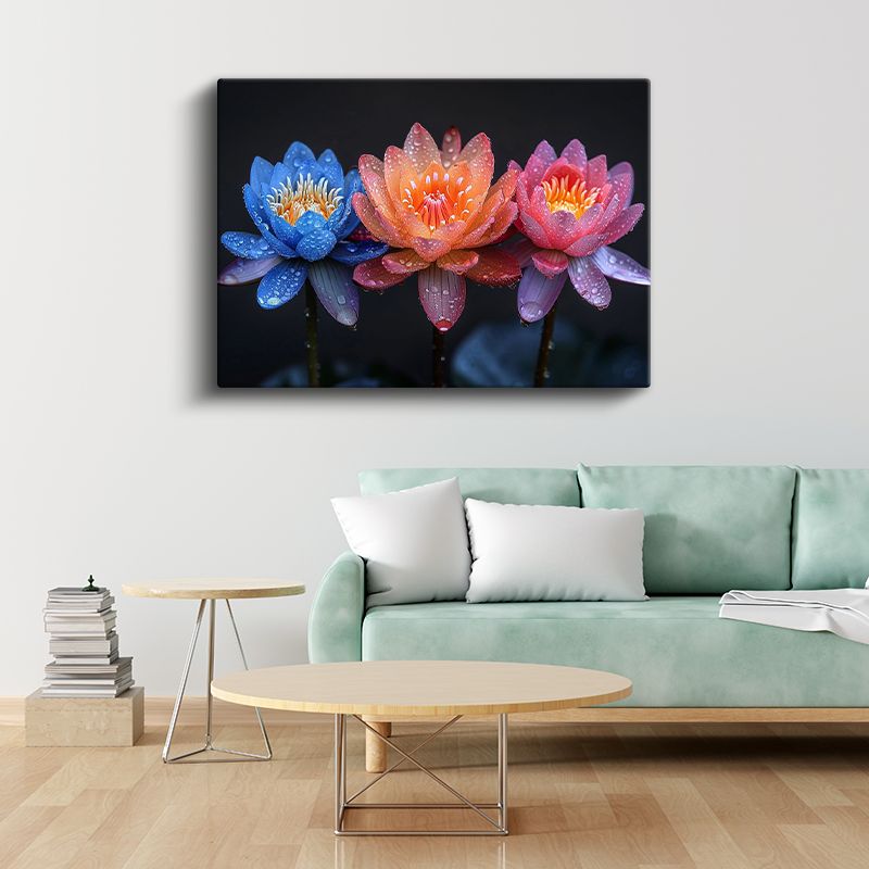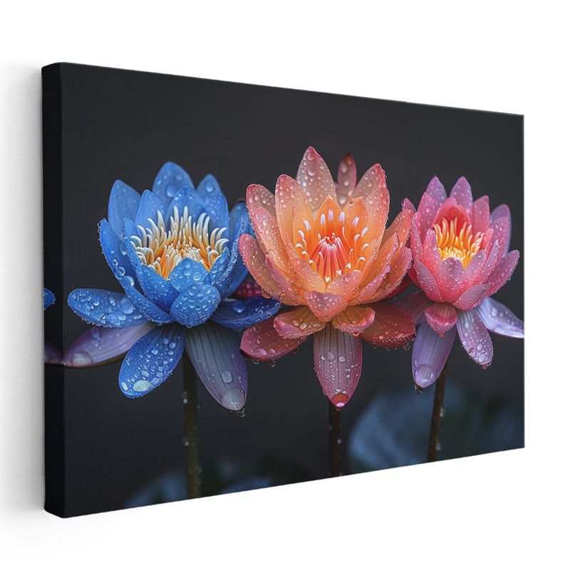 Renkli Nilüferler - Çiy Damlacıklı Üç Renk Lotus Kanvas Tablo