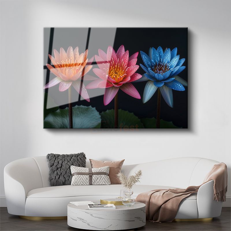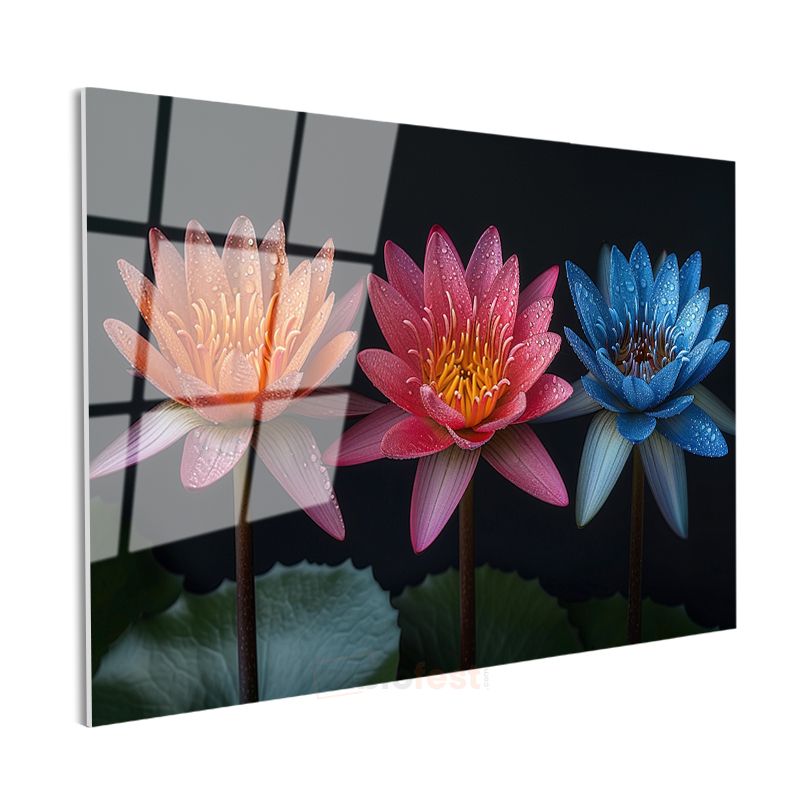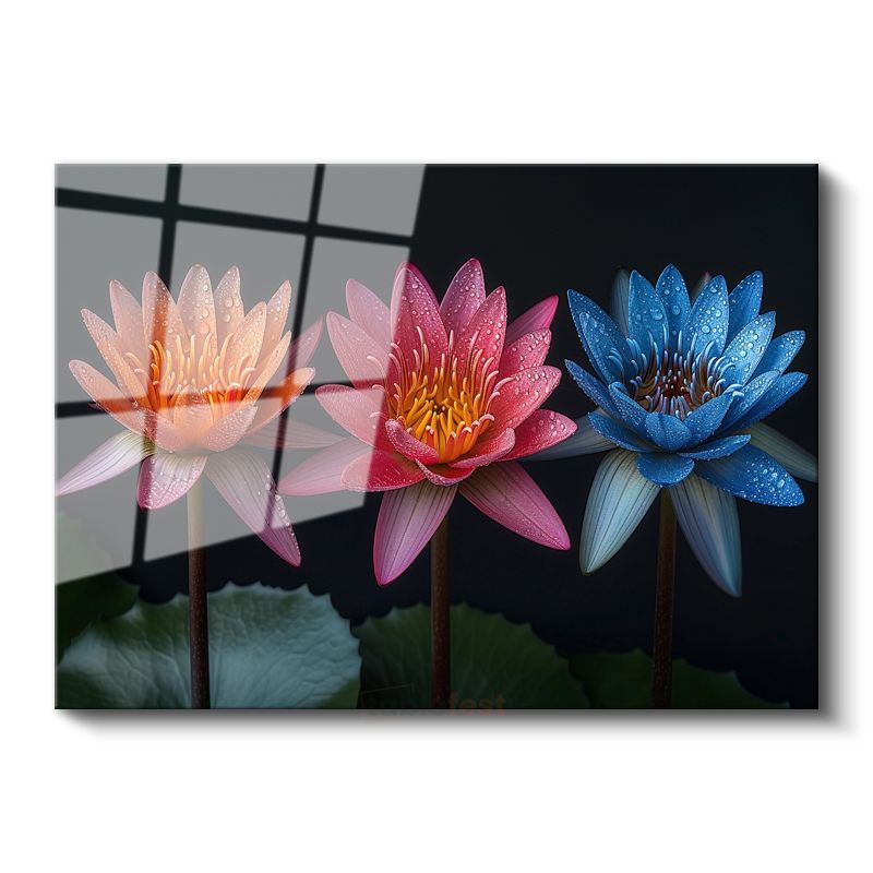 Renkli Nilüferler - Siyah Fonda Çiy Damlacıklı Çiçekler Cam Tablo