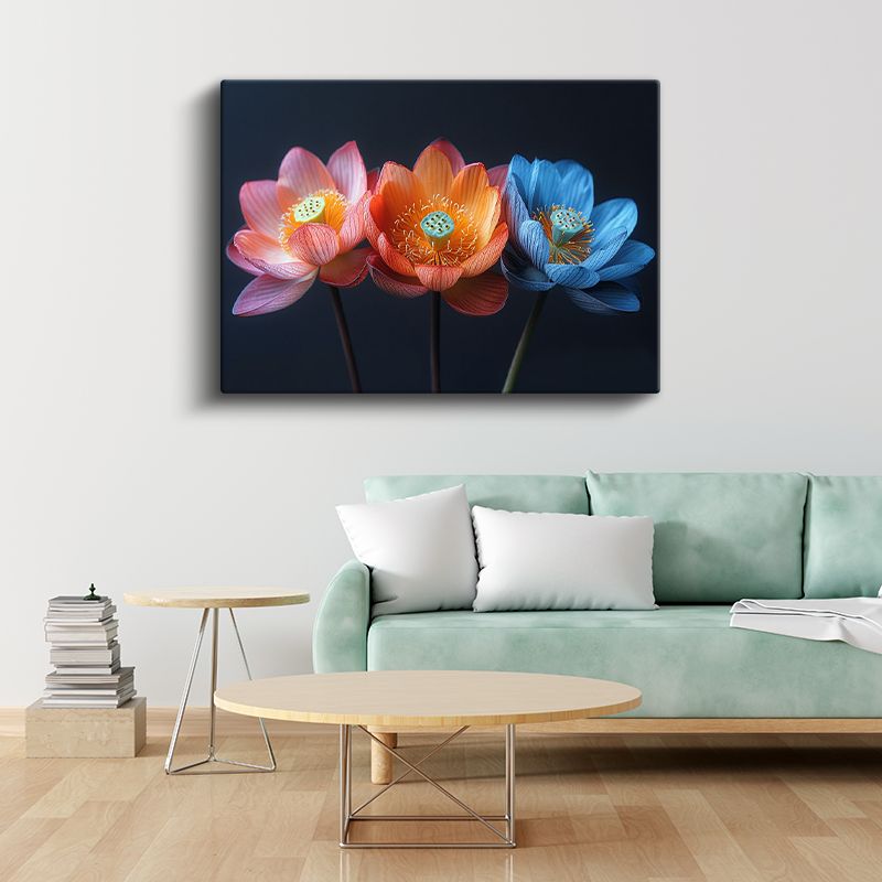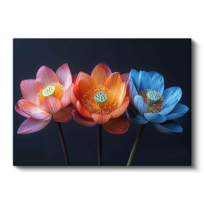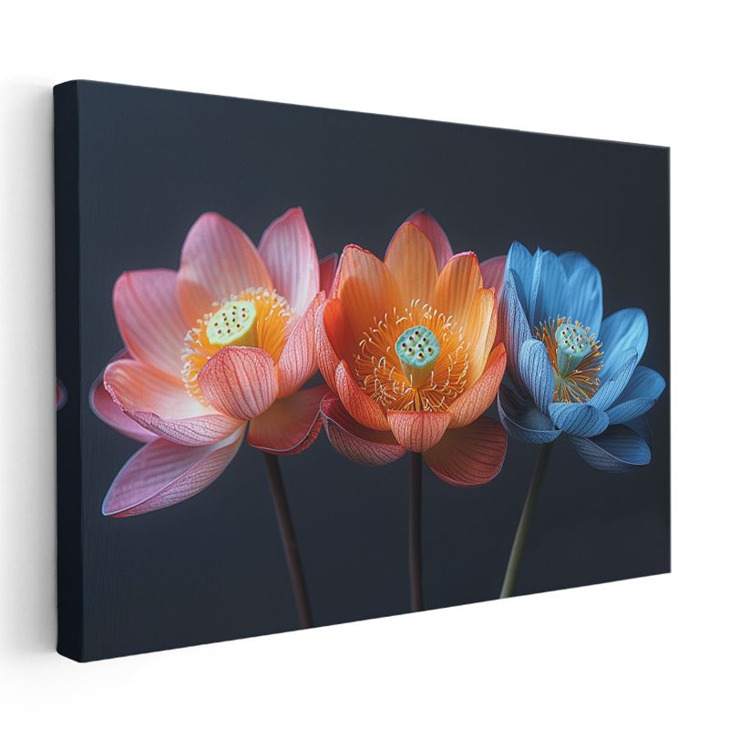 Renkli Nilüferler - Siyah Fonda Zarif Çiçek Portresi Kanvas Tablo