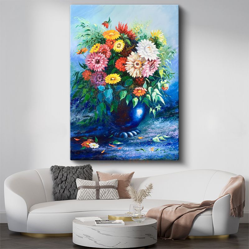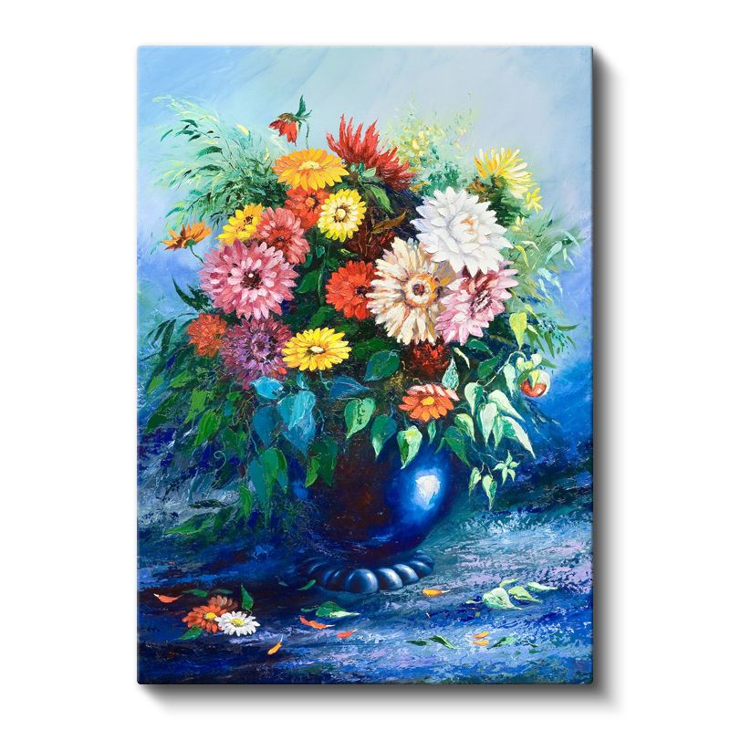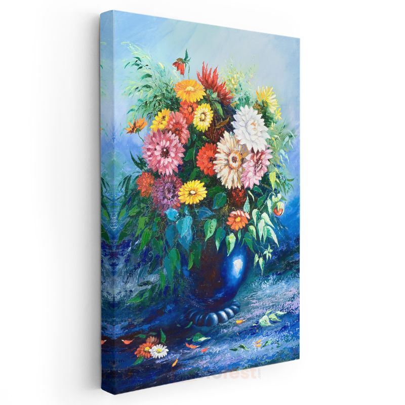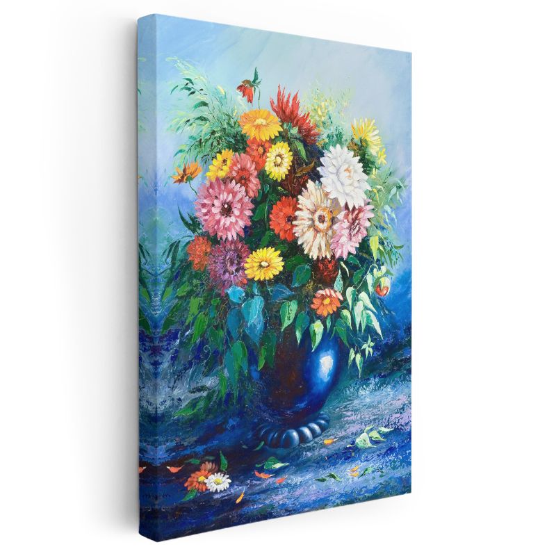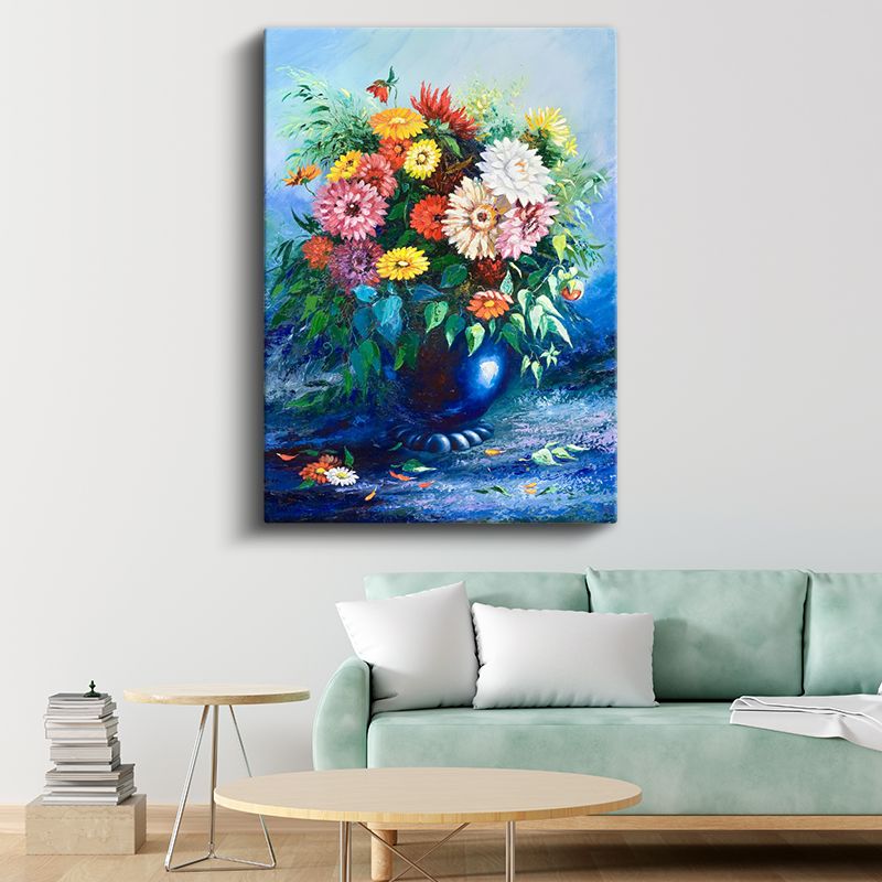 Renkli Papatyalar - Mavi Vazoda Çiçek Aranjmanı Kanvas Tablo