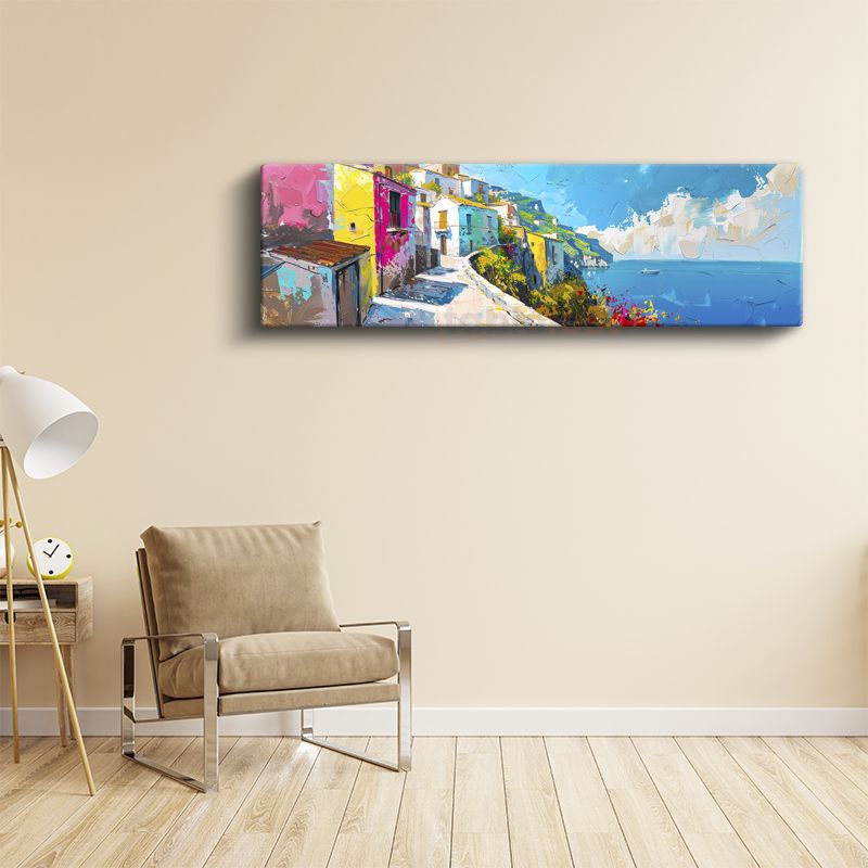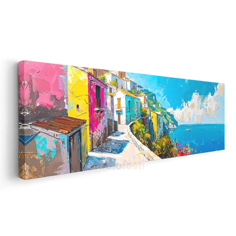 Renkli Sahil Sokağı - Mavi Deniz Manzarası Kanvas Tablo