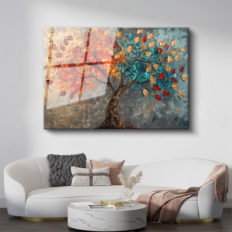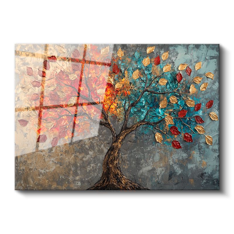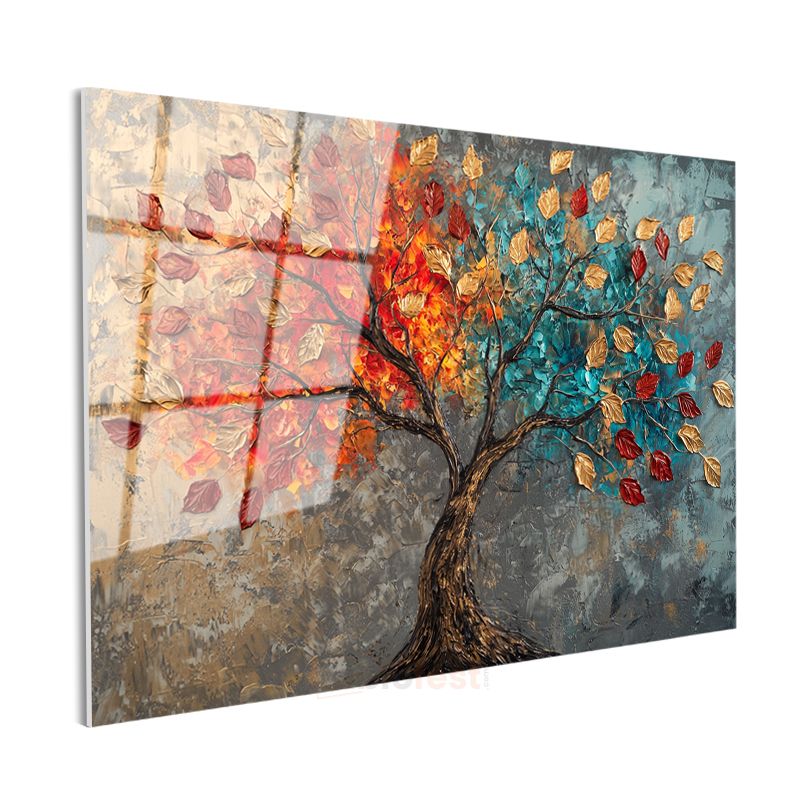 Renkli Sonbahar Ağacı - Tekstürlü Yaprak Detaylı Sanat Cam Tablo