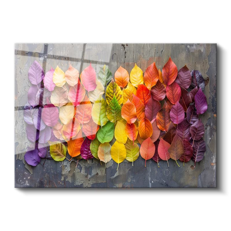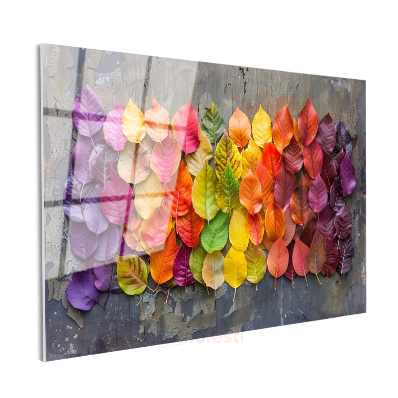 Renkli Sonbahar Yaprakları - Ahşap Dokulu Dekoratif Cam Tablo